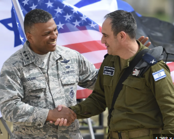 Gen. Richard Clark, left, U.S. Air Force 3rd Air Force commander, and Israel Defense Force (IDF) Commander of the Aerial Defense Array, Brig. Gen. Zvika Haimovich, shake hands during the combined missile defense exercise Juniper Cobra 2018 in Israel.