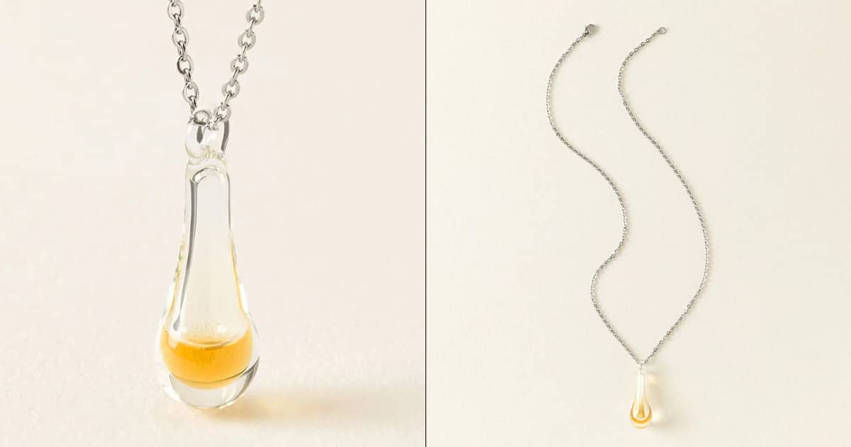 This thought-provoking necklace consists of a handblown glass pendant holding a single drop of real honey that a honeybee produced over its entire lifetime.