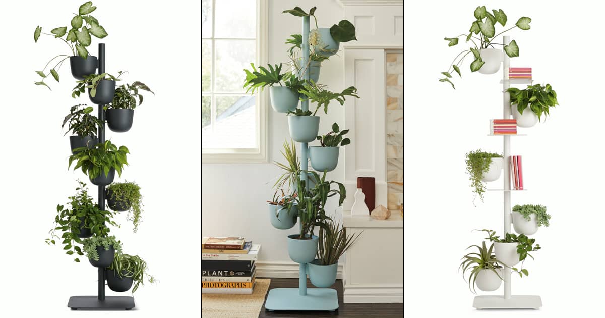 This minimalist vertical planter tower has 9 rotatable planter bowls that can hold plants, flowers, or anything you wish in a compact, space-saving footprint.
