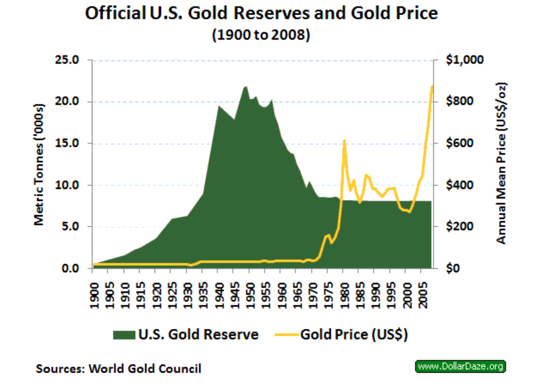 What trajectory did the US gold reserves follow in the last century? Below is a World Gold Council chart that might be accurate, although there is some debate today about exactly how much of the US gold reserves are accurately accounted for. Some say a portion of it is no longer there, some say that a percentage has been used in financial transactions that would involve claims to some of it. But the chart is probably not far off. You can see that gold began leaving the country starting in the mid-1950s. By the end of that decade a few wise financial advisors were recommending investing extra savings – i.e. savings one could afford to risk – in numismatic gold and gold stocks. (It was illegal to hold gold outright.) The reason was that the gold standard kept the official dollar price at $35, but there was so much dollar inflating going on that foreign countries were smart enough to get gold instead of holding onto dollars (which dollars had been received in payment for imports), and this was causing the unofficial market gold price in dollars to rise. That’s why in 1971 Nixon probably looked at a similar chart and finally said stop, no more, we’re “closing the gold window.” And that’s when the dollar price took off, as wise advisors had predicted it would. More accurately, that’s when the exchange rate for dollars plummeted and price inflation in the US began to explode. (Yes, price inflation can be late to the party, but it always follows a period of monetary inflating.) (The yellow line represents the dollar price of gold.)