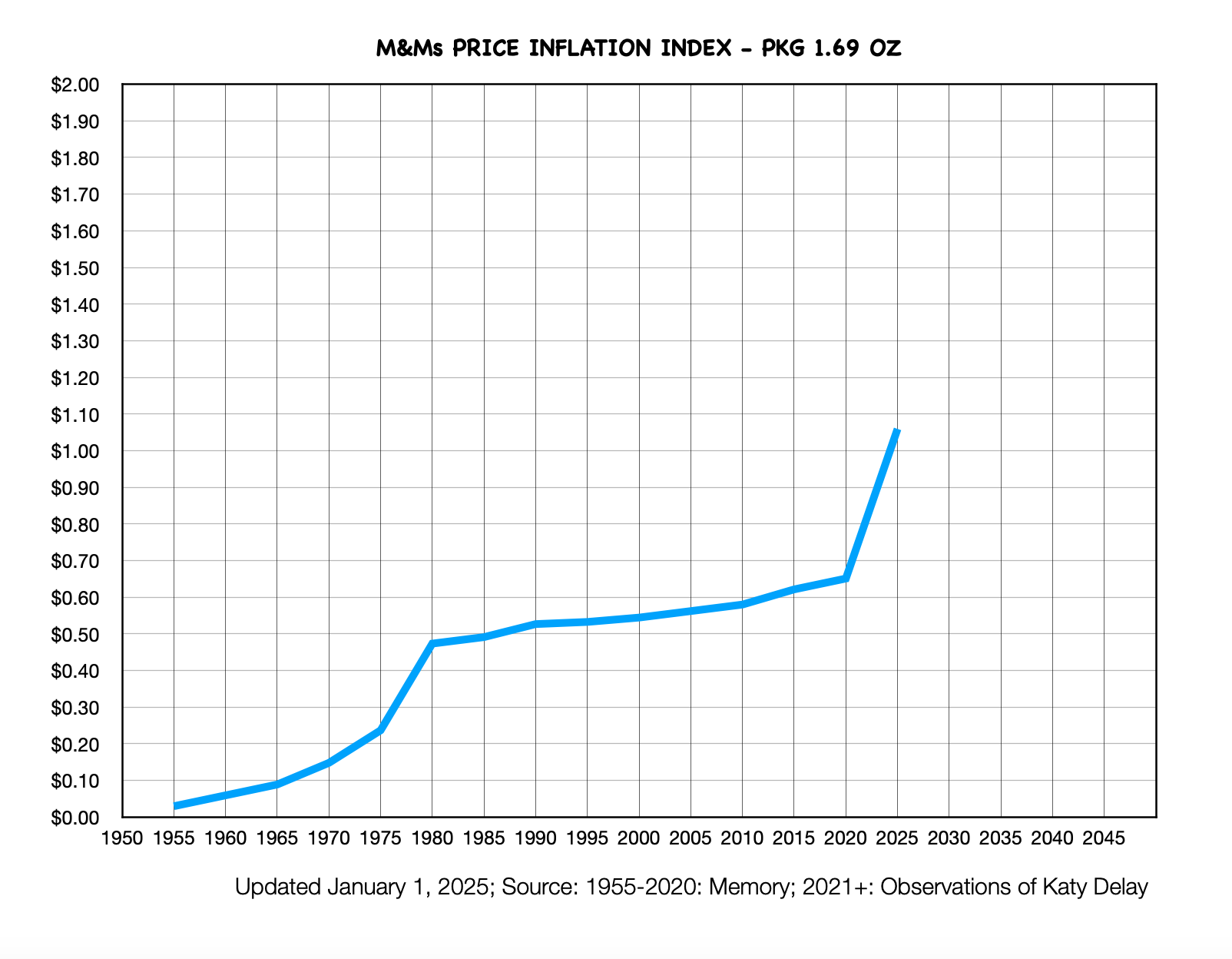 2025 is already upon us, and it’s time to update the M&Ms Inflation Index. Like some of you, I remember when a 1.69 oz packet of M&Ms was 5 cents. Yes, that’s back in the 1950s. Today, the price of that same packet has gone up to $1.79. For you mathematicians, that’s a whopping 3,480%! And that means the dollar’s purchasing power has gone down in the opposite direction, maybe something approaching the same amount only in reverse. M&Ms are made by the Mars Company. (By the way, the Mars family has quite an interesting history.) They have made it a point to offer the 1.69 oz packet since the company began to make them, come hell, high water, or monetary inflation. Of course they also understood that a variety of sizes and prices can please the public, so you find their products in a plethora of different packaging. So for the economists among you, here below I have updated the chart for the 1.69 ounce pack: A professional economist friend of mine, Peter Earle at AIER, explained that price inflation has certainly contributed to the uptick in our favorite snack. In this particular case, however, there is another factor: cocoa bean farmers are having terrible problems with their crops, especially in Africa where most of them are produced. Here’s a chart giving the price of cocoa for the last five years, from TradingEconomics.com: