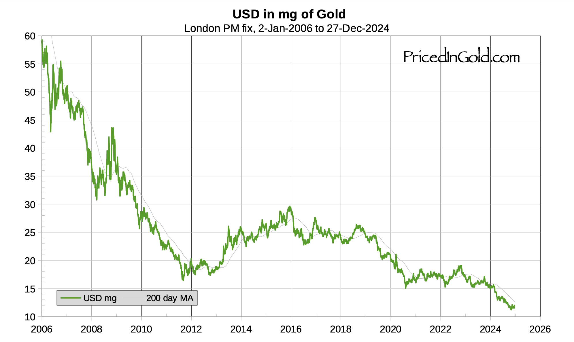 I also like this one from PricedinGold.com, showing how many milligrams of gold you can buy for a dollar. It really hits where it hurts. And for this you can blame the indebted-dollar farmers at the Fed and the distributors of these inflated and borrowed dollars: Congress.