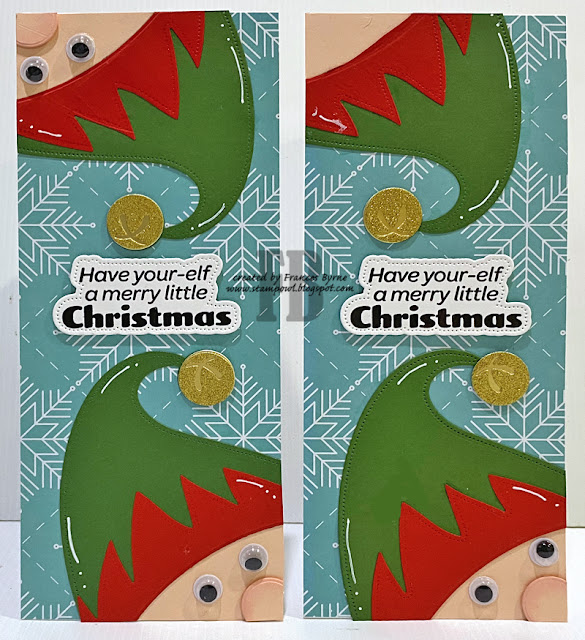 To decorate my card, I used Spellbinders Chimney Capers die set. I added the “Ho Ho Ho” sentiment to the moon area. I also added two strip sentiments to the bottom of the card using the Marry & Bright Sentiment Strip Betterpress set.