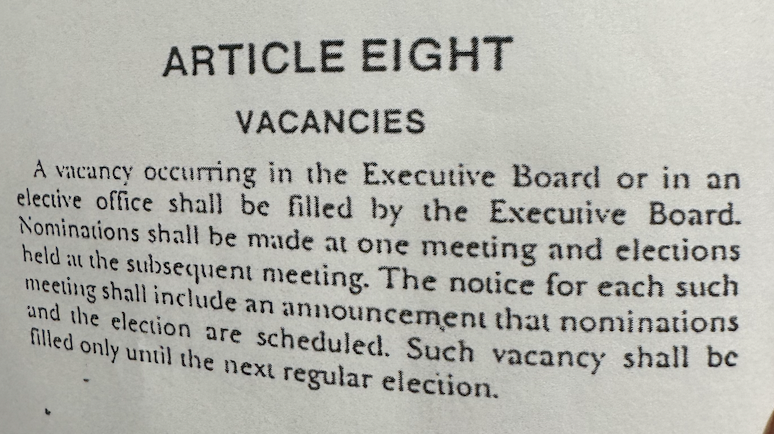 make them hold an election. Anyone up for Assistant Secretary? At the RTC EB meeting Tuesday afternoon Brown's name came up over his embarasing performance at one of our meetings and his pity me performance over his initial support for a Kathy Hochul pension refinement plan and the subsequent backtracking. Brown did not make many friends at that meeting but retirees can't vote so it may have no effect. At the RTC EB meeting as usual there is some level of frustration over what I perceive to be a lack of militancy. Lots of complaints over Mulgrew's not calling on retirees who have passed numerous resos at their meetings yet are not allowed to present them at the DA. For instance, we have a dozen vacancies on the RCT delegates - we elected 300 in June 2024, this shutting out every Unity retiree. We now have a dozen vacancies (deaths, dementia, people who didn't expect to win) and people waiting to replace them but the Unity machine claims we don't have a right to replace them. By "we" I mean the RTC Exec Bd. Read this from the RTC constitution: "A vacancy in the exec bd OR in an elective office -- the DA delegates are an elective office - shall be filled by the Exec Bd. And we have been filling vacancies on the EB and are in the process of holding an election on March 3 - my Bday -- for a vacancy with 4 candidates running. We held nominations yesterday. What bothers me is the apathy of the people on the board over the vacant delegates. We get a ruling we can't replace them and Bennett Fischer just seems to accept that ruling without pushing back - or if he pushes back it is never public. Like how about putting this in his newsletter to the 70k members or at the very least in his CL report at RTC meetings which are attended by about 1200 people in person and remote?