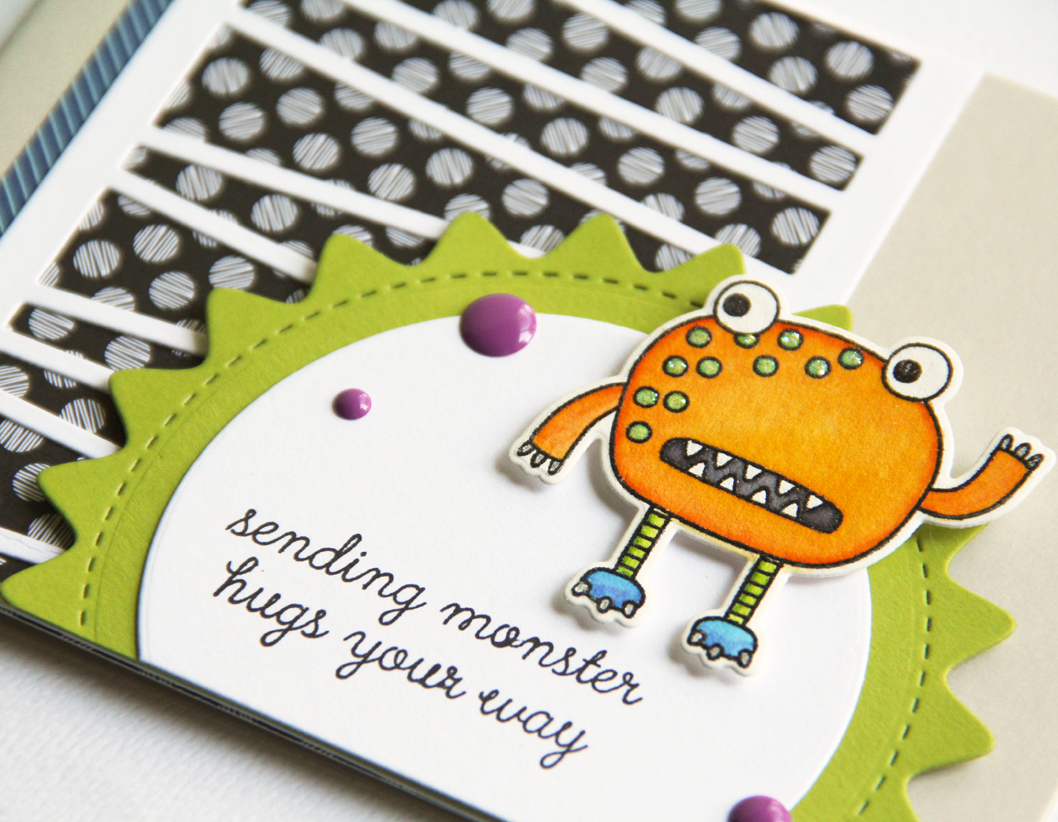 To create my card, I started by first creating a Stone card base and adhering a small strip of striped patterned paper from the Warm Hearts paper pad. I then die cut a piece of Cloud White cardstock using the Wonky Stripe Panel Confetti Cuts and backed it with one of the patterns from the Every Little Bit paper pad. Next, I stamped one of the monsters from Monsterous in Versafine black ink onto watercolor paper, and heat set it with clear embossing powder before coloring it with Zig Clean Color markers.