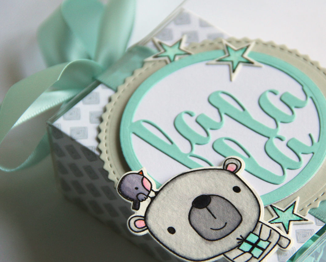 Next, I die cut Stone, Cloud White and Iced Aqua cardstocks using the Fa La La Circle Confetti Cuts, layered them together, and then secured them to the treat box using Scor-tape. To finish up, the bear and stars were adhered to the treat box front, then I covered the stars with Sugared Distress Stickles.
