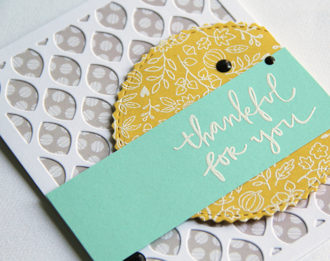 The circle die cut was then adhered to the card front with foam tape. One of the sentiments from Autumn Blessings was stamped in Versamark ink onto Iced Aqua cardstock, heat set with white embossing powder, then adhered to the card base. To finish up, I embellished with black enamel dots.