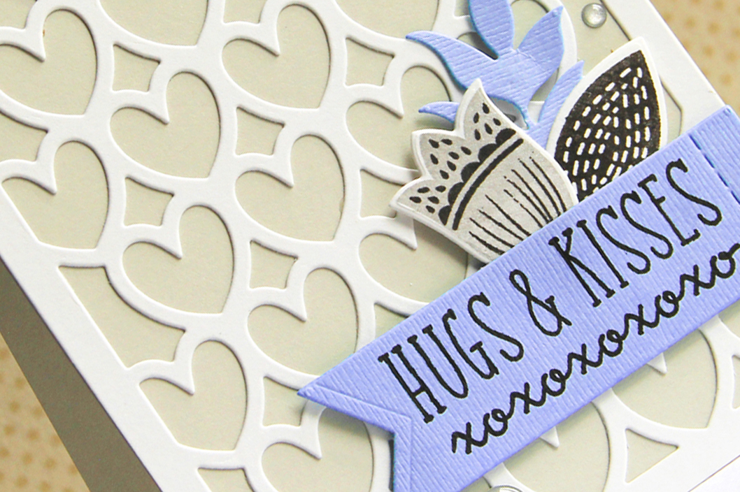 To create my card, I first die-cut a heart background using the All Heart Cover Panel Confetti Cuts on Cloud White card stock and adhered it to a Stone card base. I then die-cut a banner for my sentiment using Bazzill cardstock, and stamped it with two sentiments from Reverse Confetti's Crazy About You stamp set in Versafine ink.