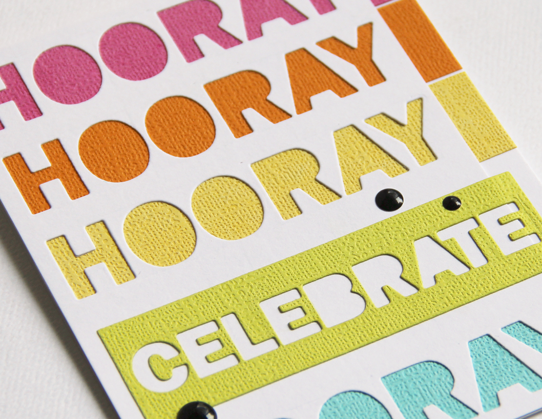 I then adhered strips of colored cardstock behind the die cut panel, leaving some excess on the right side. The panel was then adhered to the card base before trimming off the excess. To finish up, the celebrate die cut was adhered to the card front, and I embellished with black enamel dots.