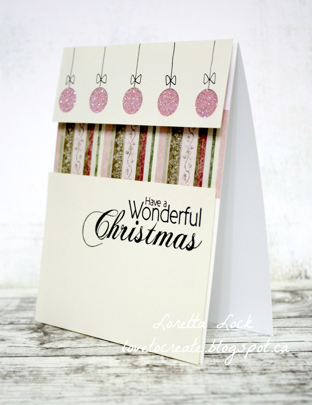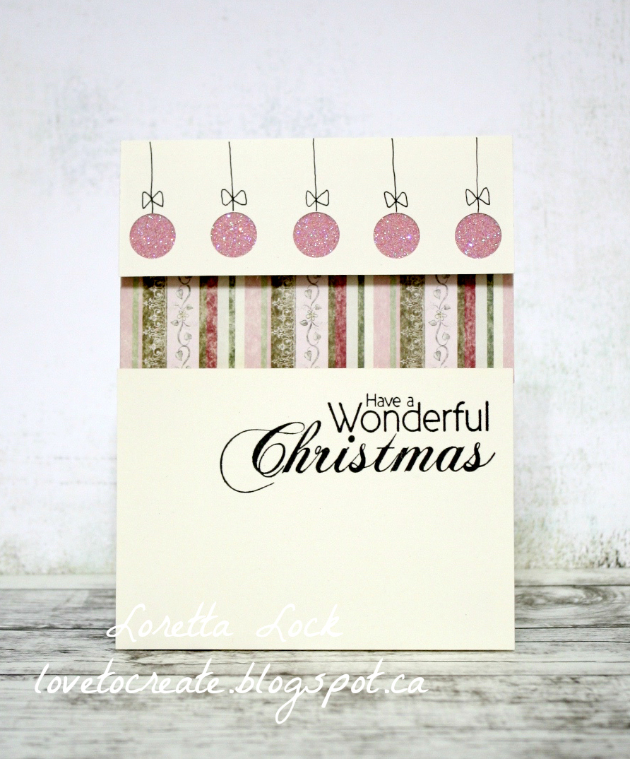 I adhered the ivory panels using dimensional foam, and the effect of the shadow is quite marvellous. I used a 1/2" hole punch for the row of ornaments, and backed it with transparent tape to adhere the glitter. I adhered dark pink cardstock behind the ornaments to bring out the pink in the pattern paper. The ornament hangers were hand drawn. I think I would draw the bows a little smaller next time!