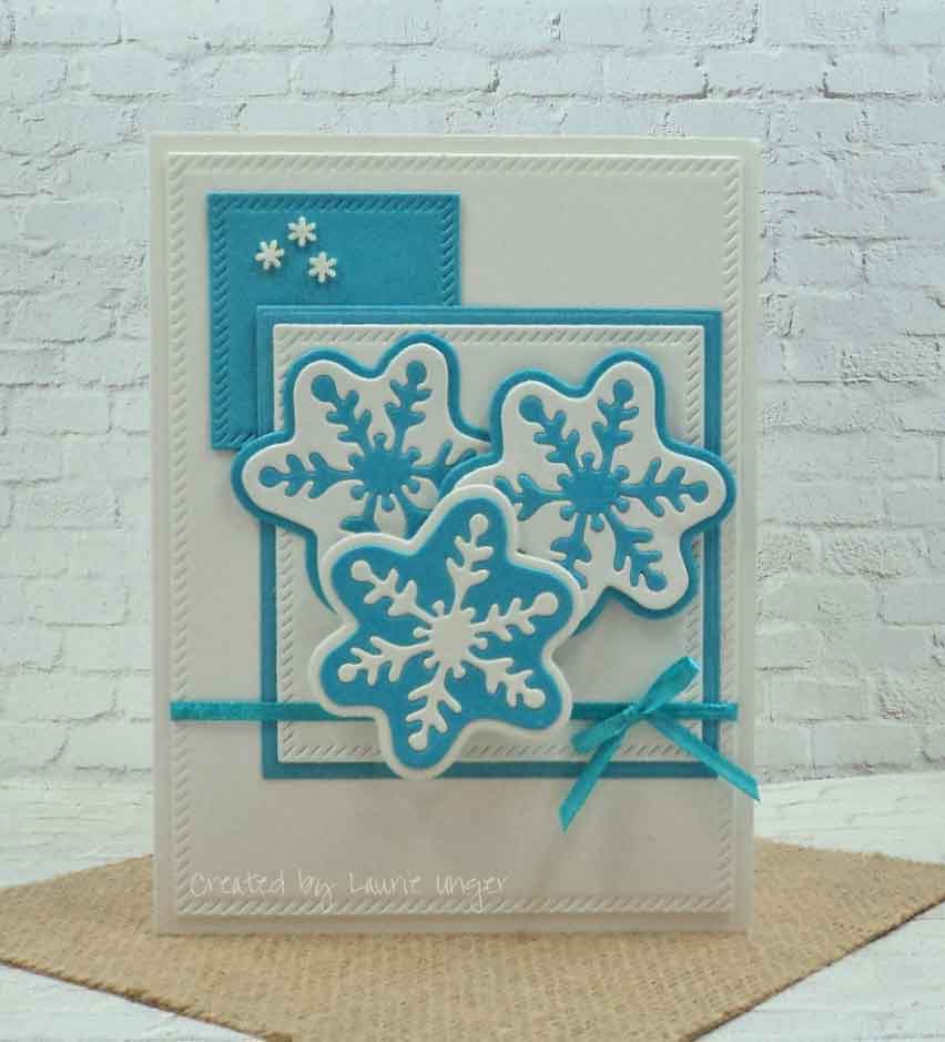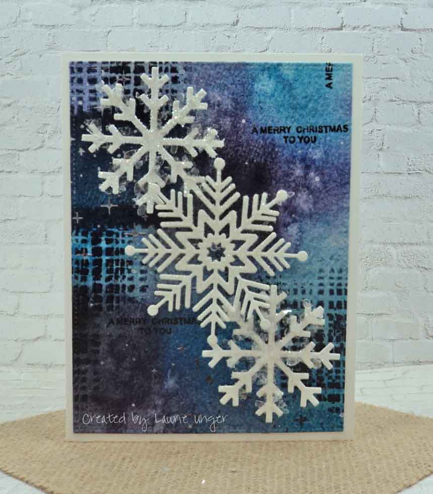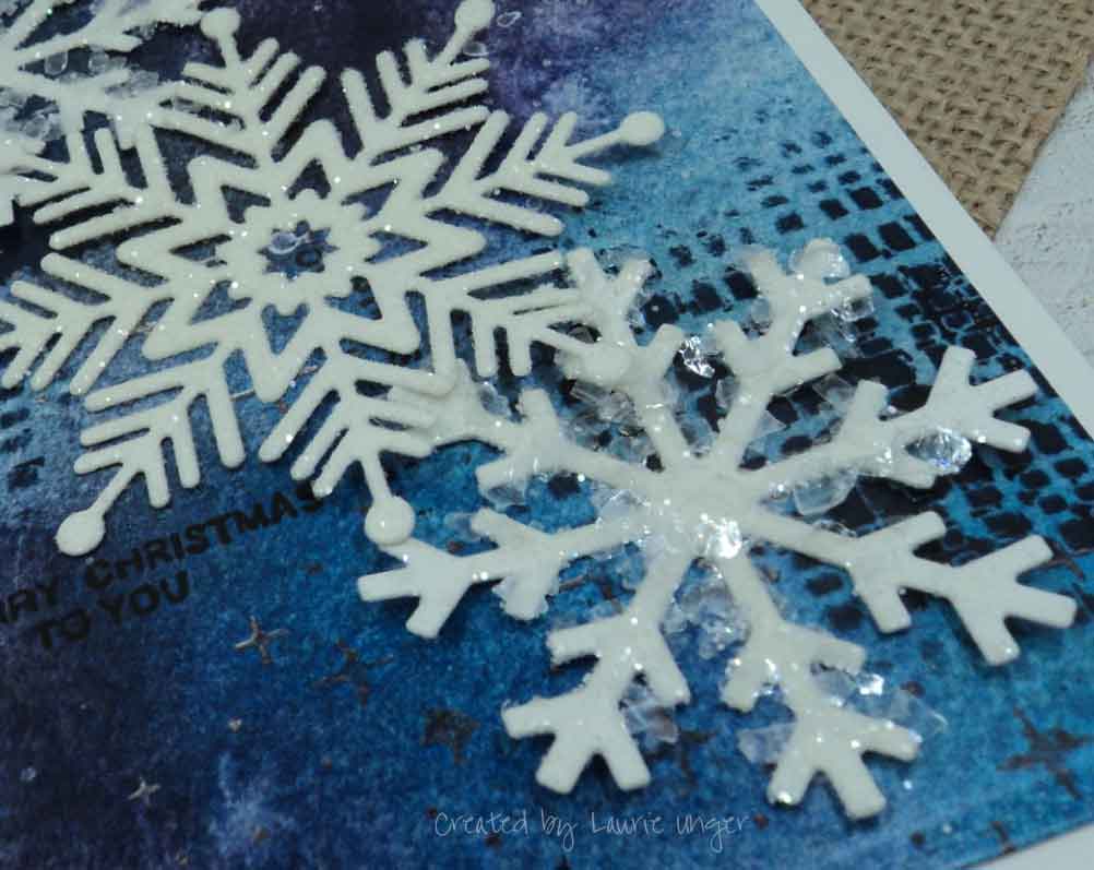 I added a bit of snowflake glitter and mica from Ranger (TH) to the top and bottom snowflakes. The dies are from My Favorite Things and the middle snowflake die is from Simon Says Stamp.