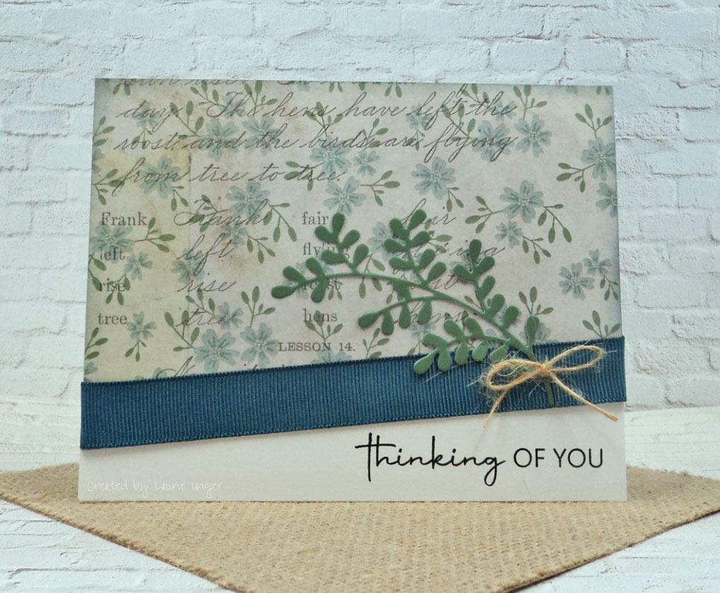 The designer paper is from Tim Holtz memoranda pack. I paired it with a strip of enchanted evening grosgrain ribbon from Papertrey, Ink. Fig leaf die is from Simon Says Stamp and the sentiment is from My Favorite Things. Added a small twine bow to ground the fig die cut and called it good.