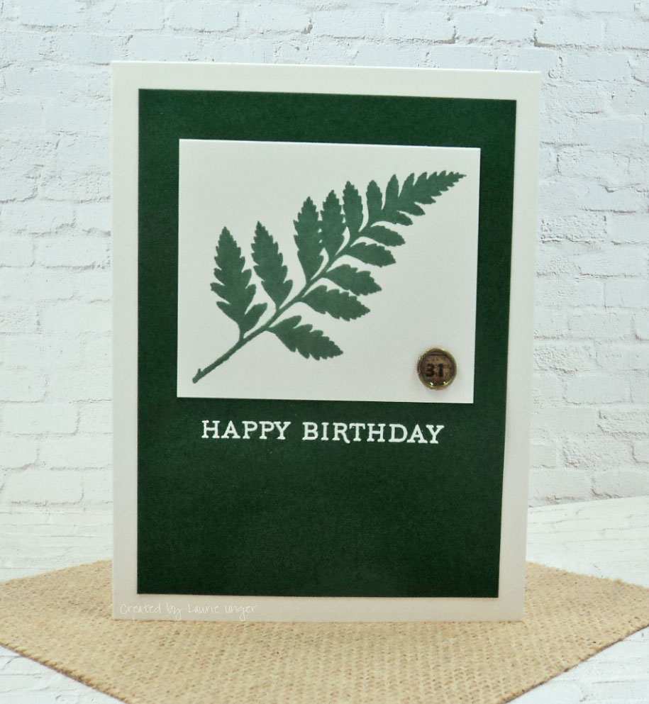 I started off with the sketch over at Just add Ink. The fern is a very old rubber stamp from the former Angel Company. I stamped it in juniper dye ink from Simon Says Stamp. The birthday sentiment is from Papertrey, Ink. I heat embossed it with alabaster embossing powder from Brutus Munroe. The circle "31" is made using a jump ring and glossy accents over a section of a numbered dsp that I had in my stash.