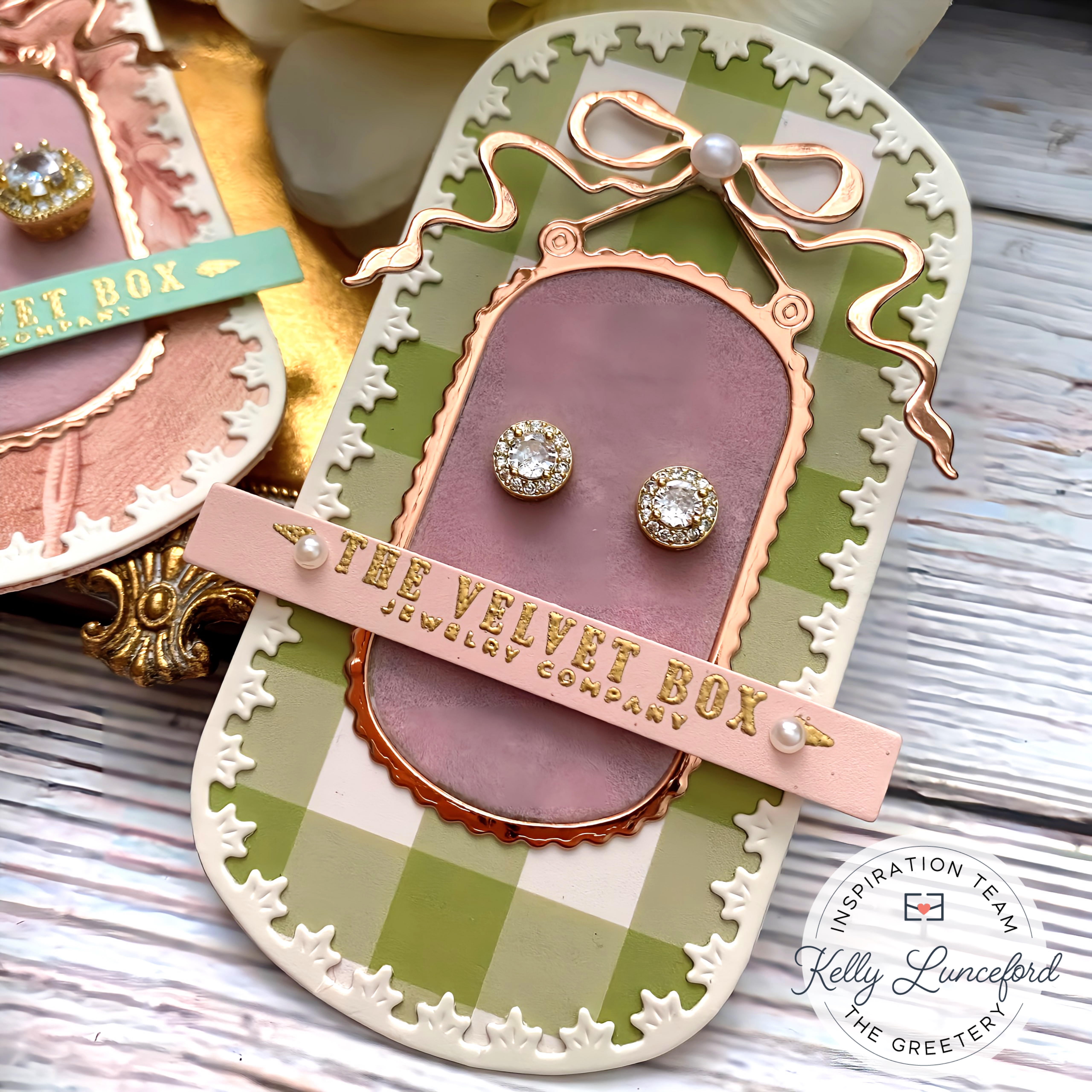 The third box is the Shakespeare & Co. Booksellers! This one is cut from Mint Julep with Lilac Grace windows and side trim and Sweet Blush accents and sign. More Rose Gold details finish this one off! Now.....I got a little bee in my bonnet and couldn't just be done! I thought it would be fun to create coordinating tags or gifts to correspond with each of the names of the stores, so we're really JUST getting started! haha! I will share them in the order that I made them and up first is "The Velvet Box Jewelry Company".