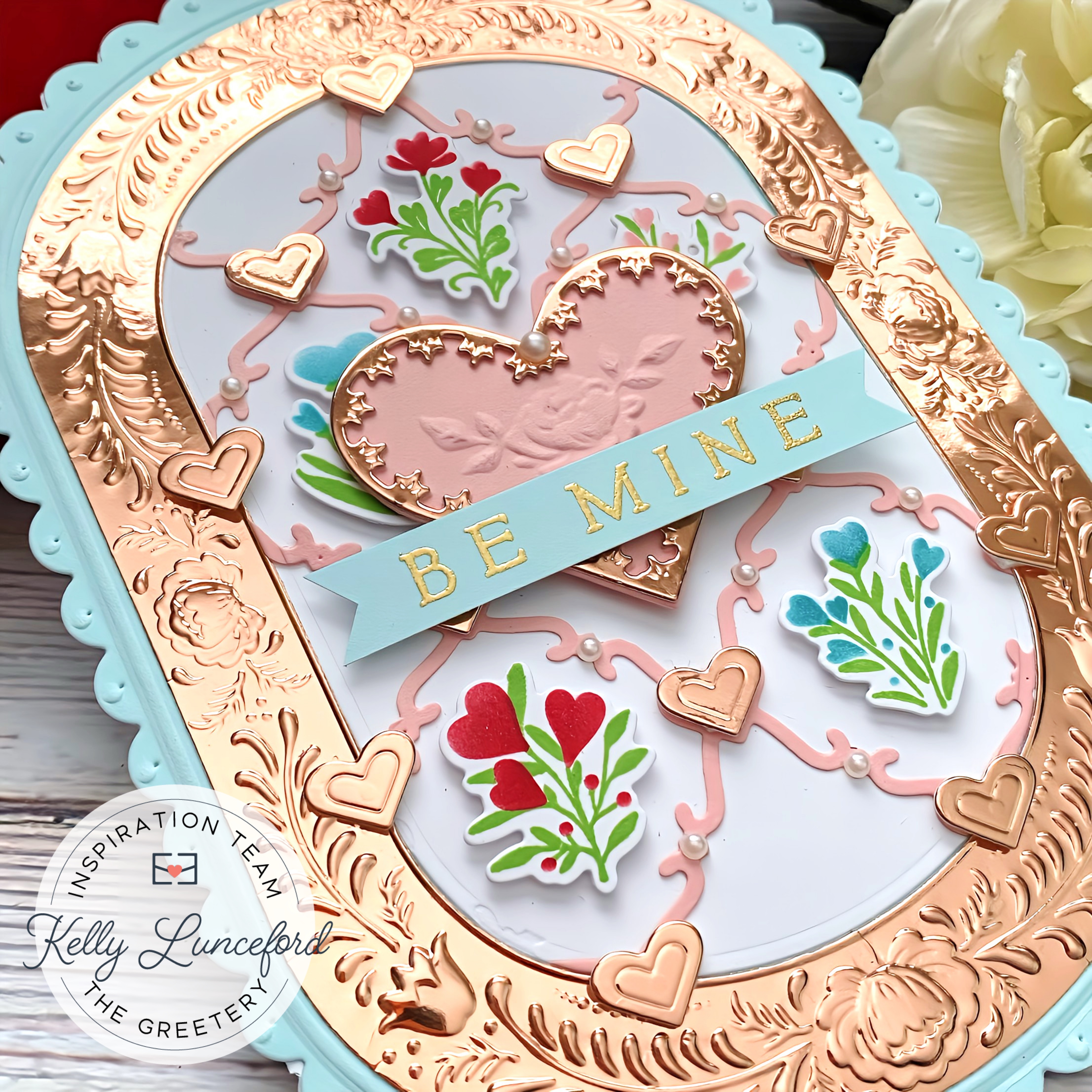 I glued it in the center and then added all of the stenciled flowers and hearts cut from the same Rose Gold cardstock. I popped them up with foam squares for dimension. I can't stop with the pearls, so I added some pearls around the diamond die cut.