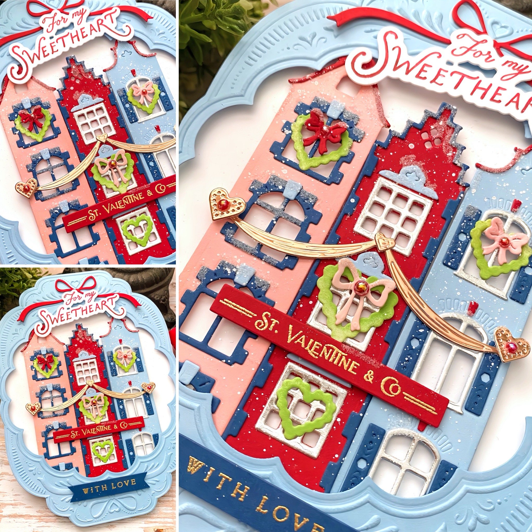 The "with love" portion of the sentiment is also from that same set and is embossed in gold on a strip of Enchanted Evening cardstock. I used the new Shortbread Shapes Scalloped Hearts Die and embossing folder for the background and the frame around the buildings.
