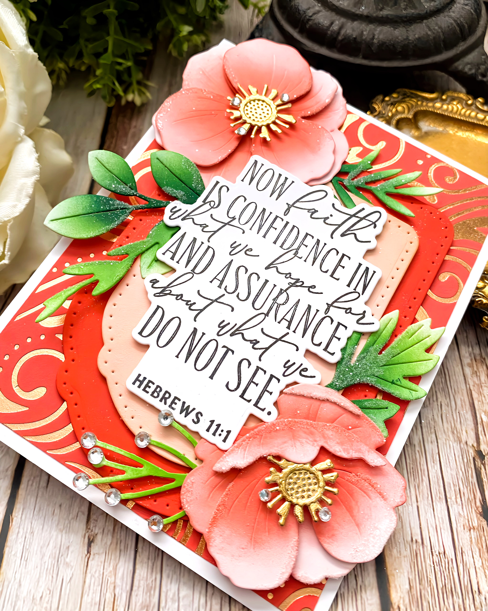 My first card for today showcases the new Reflections: Hebrews 11 Stamp/Die set. I always enjoy adding flowers to these types of cards and this one is no exception. I had prepared this background in hopes of using it on my Wrapped in Love card that I shared yesterday, but it was too busy for the card and it was just waiting to be used. I thought this would be the perfect opportunity, so it does have the same color combo as yesterday's card. I used the Ornamental Swirl Hot Foil Plate with blush foil on an A2 panel of Berry Sorbet cardstock. I trimmed it down to measure 5 1/4 inches by 4 inches and added it to a top-folding A2 card base using liquid glue.