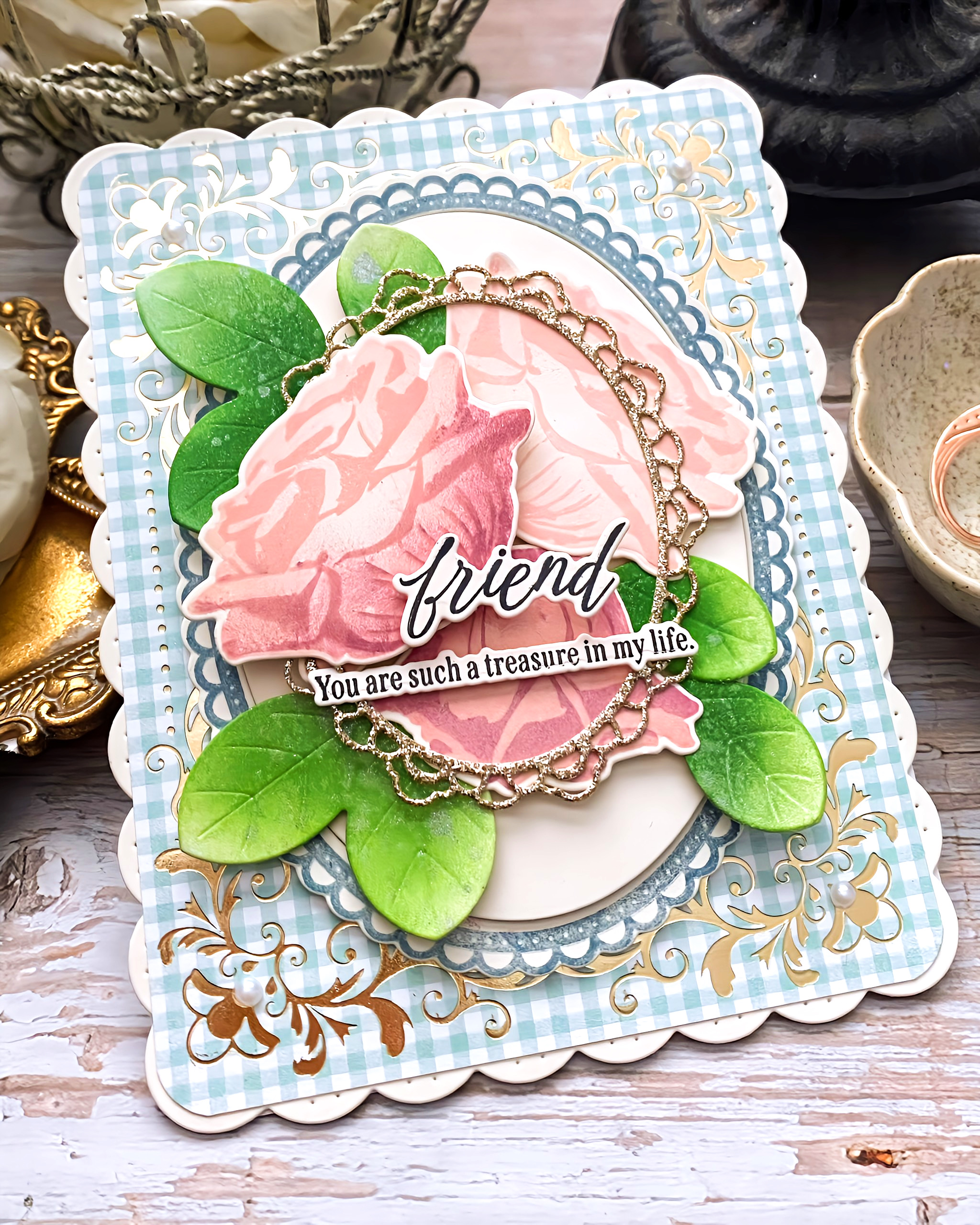 I used the new Love to Layer: Lacey Ovals Die and the new Filigree Frame Hot Foil Plate to add extra detail, sparkle, and shine.