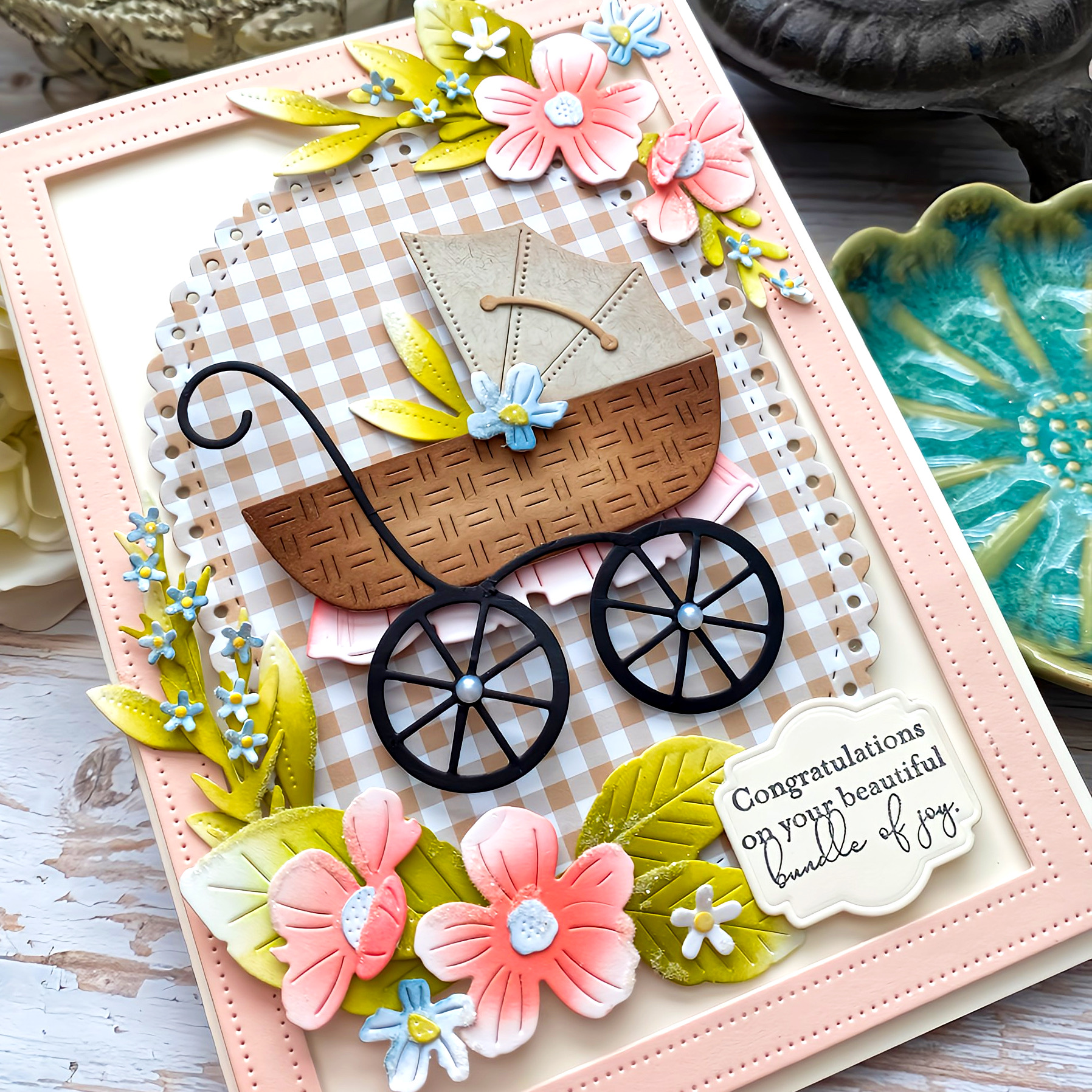 It's my turn for the Project Inspiration feature for Papertrey Ink! My baby card stash is running low and I need to replenish it! I decided to create a baby card for the feature and I was inspired by a set of sugar cookies that popped up in my feed. They were extremely "beige", which I know a lot of moms these days like, so I split the difference and added more color, but kept the beige/greige! haha!I had a lot of fun working on this card and I will share step-by-step photos and instructions, with a few tips along the way! Step 2: cut the ovalfrom gingham paper and mount it to the card base using foam squares. This particular paper is quite thin, so I actually die cut another oval from a scrap of cardstock and glued the two together before adding it to the base. Step 3: cut all of the pieces needed for the baby buggy Add some shading around the carriage portion. Glue everything together and adherent to the oval using foam squares. The pink "blanket" hanging down is actually the ruffle included in the In Stitches: Onesie Die. I wanted to incorporate the flower colors a bit more and this was just the ticket.