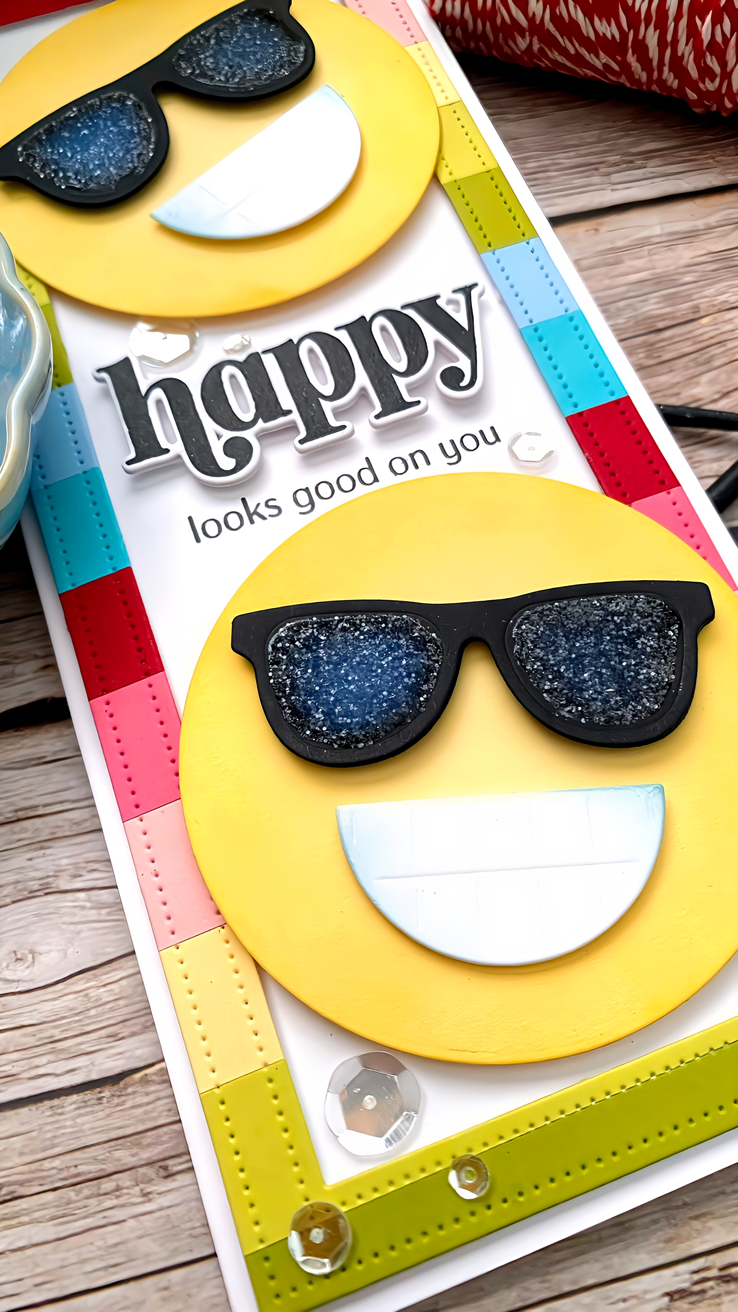 Before I added anything to the card base, I stamped the "looks good on you" portion of the sentiment in black and then added the "happy" portion using foam squares. It is stamped once, but stacked onto two other diecuts for a sturdy piece. Once the glasses were dry, I added them to the circles using foam squares, along with the teeth. I adhered them using double-thick foam squares so they would pop up further than the frame. I toyed around with making a shaker card and in the end nixed the idea because I didn't want to use that many sprinkles, sequins, fillers, etc. so I opted to just add a variety of sizes across the front of the card to give it some playfulness.