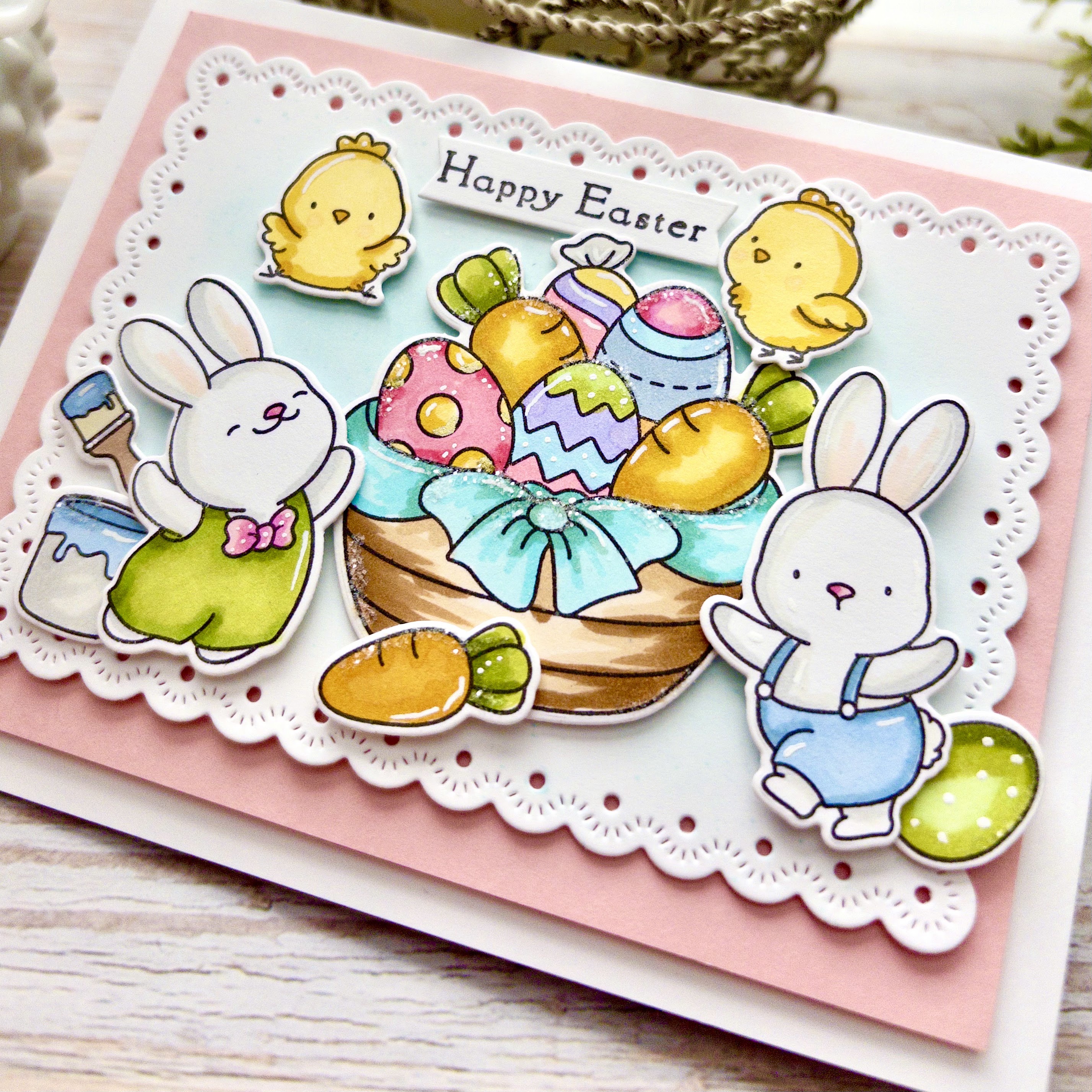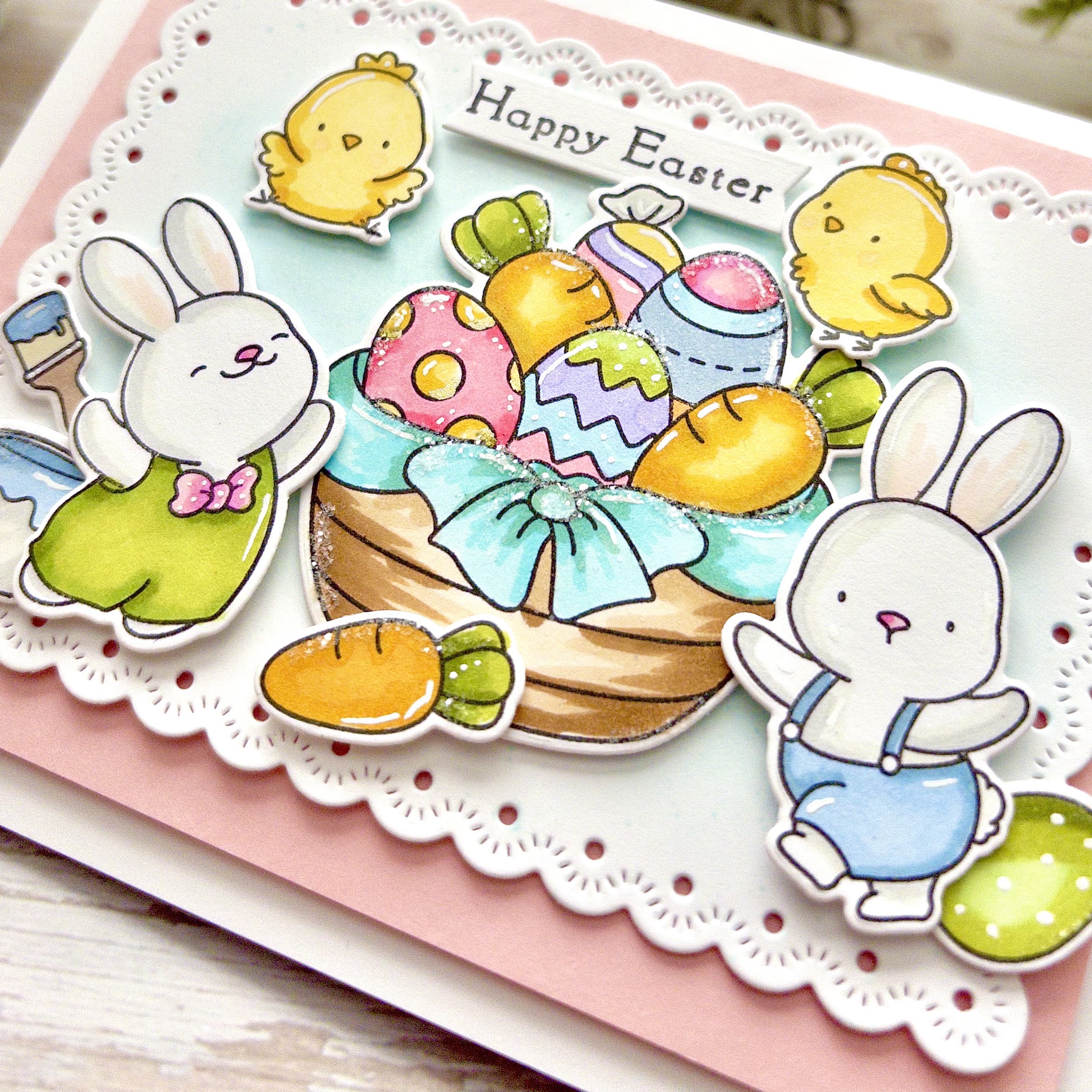 I can't believe Easter is on Sunday! It feels like it has arrived so quickly this year! I couldn't let the special day go by without creating a card with this absolutely DARLING stamp set from Pink and Main. This is one of those must-have stamp sets for me and I bought it back in January when it came out and FINALLY took the time to create with it! I adore the sweet bunnies and chicks and I have really missed coloring!