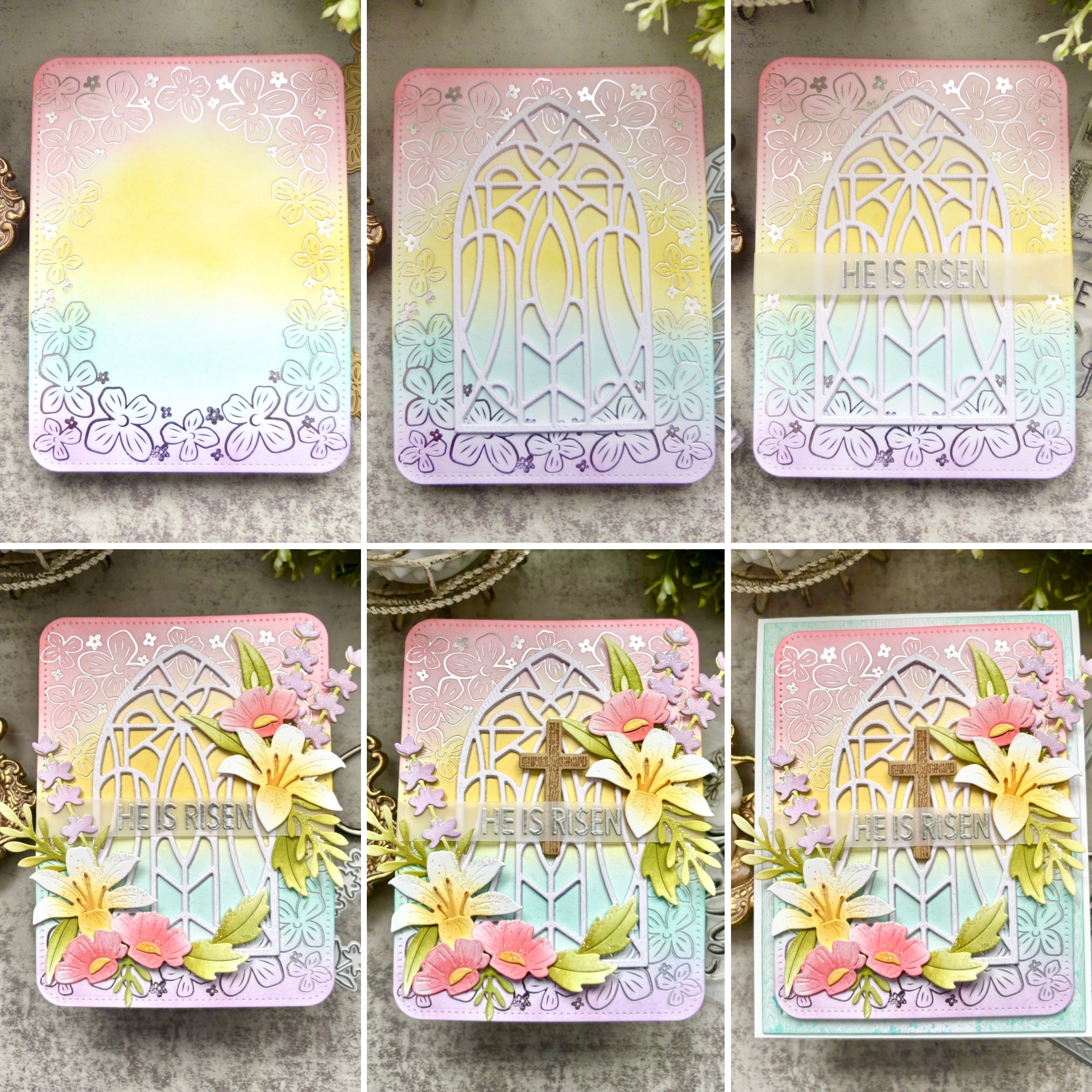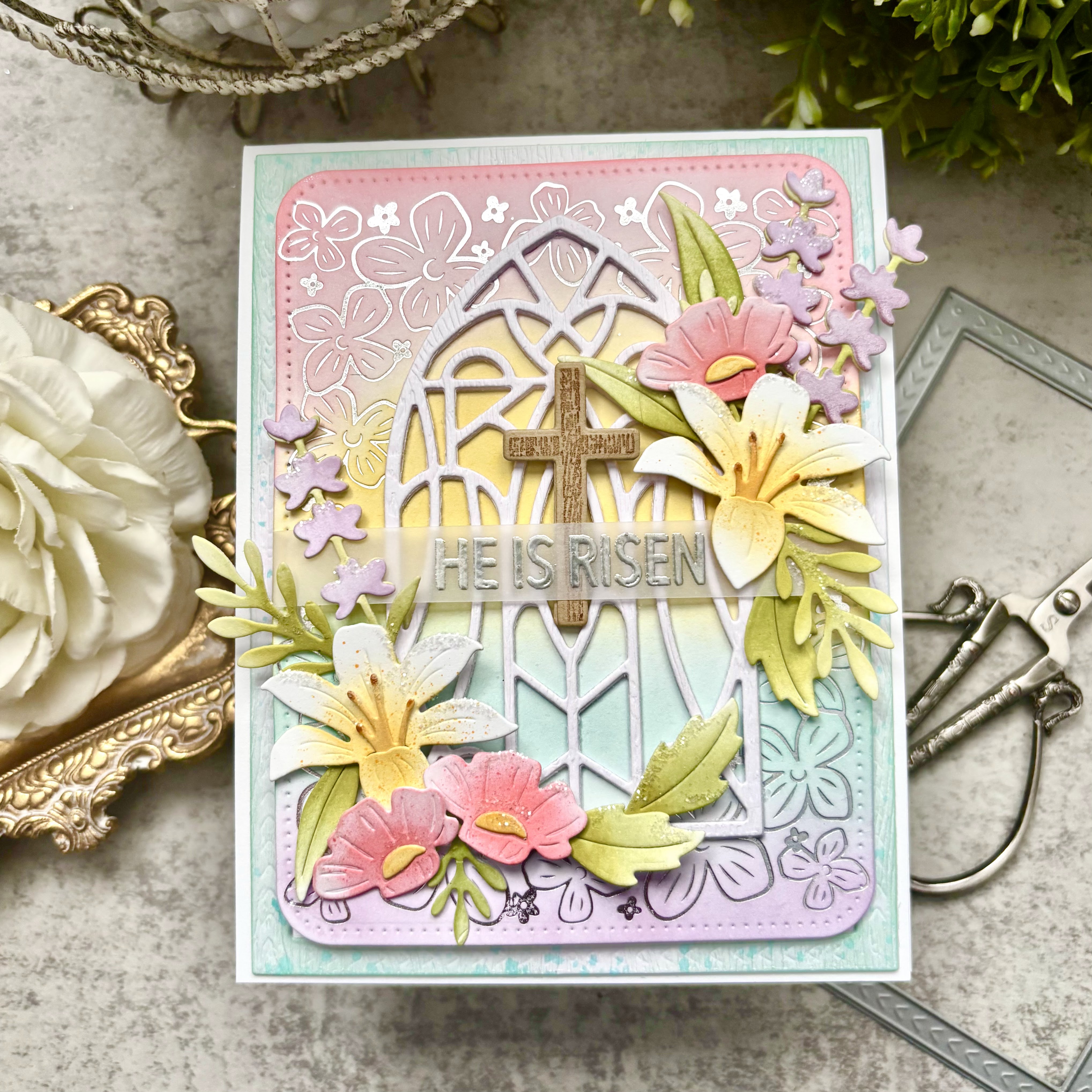 Step 3: Heat emboss the sentiment in silver using the Just Sentiments: Easter Mini Stamp Set on a strip of vellum and secure it to the back of the panel using clear tape or the adhesive of your choice.