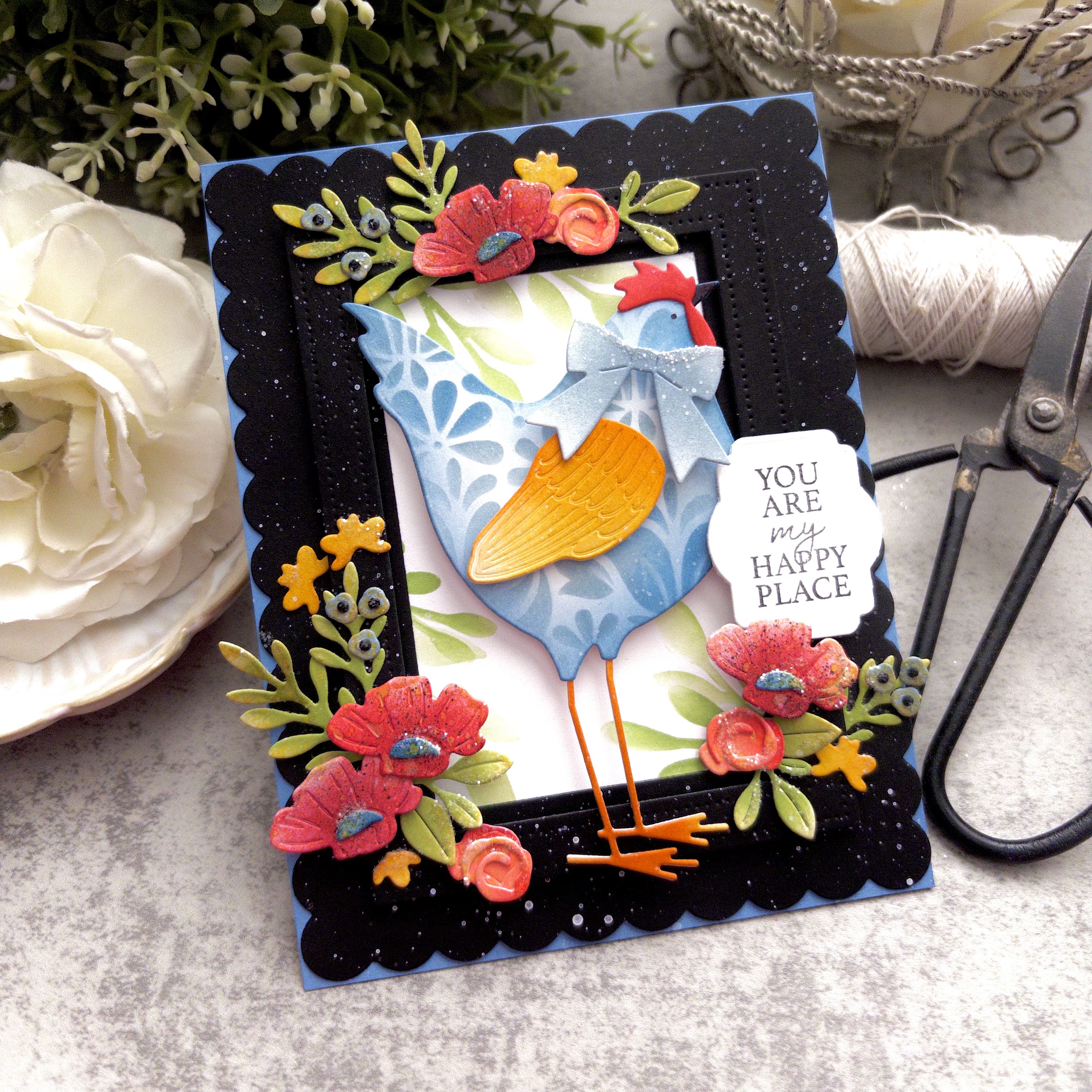 The rooster is also cut from white and colored the same way as the flowers and leaves. I did add the stenciling to the body of the rooster using the Country Rooster Stencil Collection. There are three different patterns included in the collection for versatility. The bow is also from the Into the Blooms: Spring Basket Die and gives this rooster a little bit of whimsy; putting on some springtime finery! I also added a dot of marker for the eye; just a quick job with a fine-tip Sharpie!The focal panel is adhered to an A2 panel of Blueberry Sky cardstock using liquid glue. I also added some white paint splatter and glitter for additional detailing. The sentiment is from the Just Sentiments: You're on My Mind Stamp Set and is stamped in black and then cut using the Just Tags Die. I secured it to the side of the frame using black foam squares. I mounted it all to a top-folding A2 card base using liquid glue. I had so much fun creating this card and I'm glad I got the idea out of my brain! haha! Thanks for fluttering by!