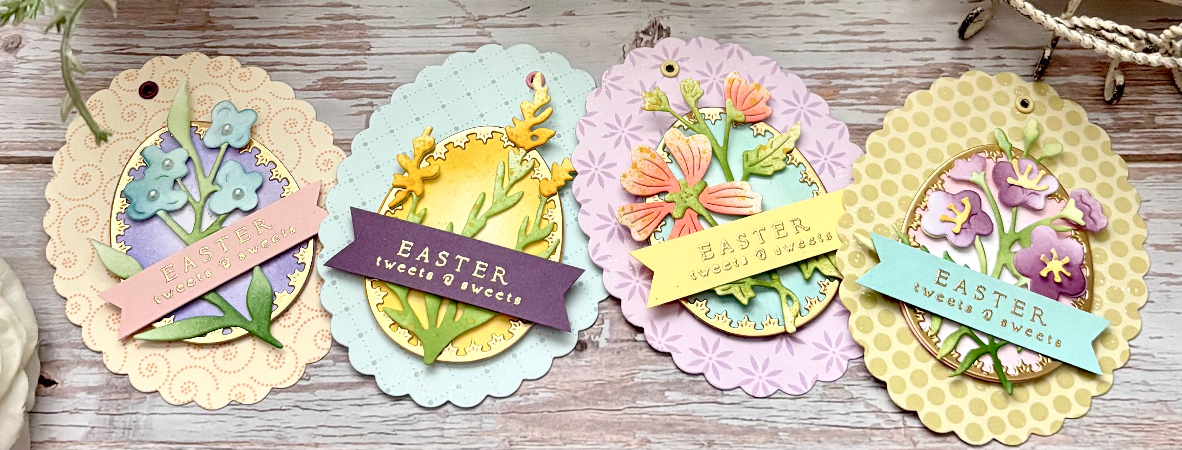 The base of each tag is one of the dies included in the Golden Egg Die and is cut from my favorite spring pattern paper: Spring Pastels, but unfortunately it is retired. There will come a time when I have used it all and I will be so sad!