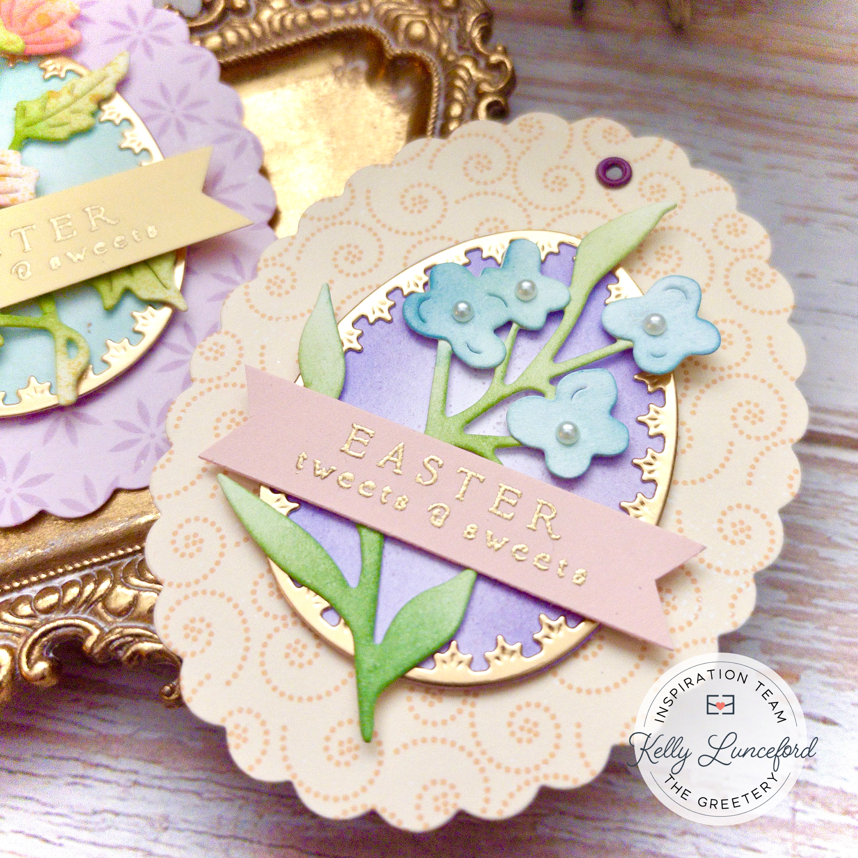 I made four in total, so I cut the base of each egg using the Golden Egg Die from white cardstock and then used dye inks and blender brushes to add the color. I made a yellow, pink, aqua, and purple egg and then added coordinating ink splatter to each one. Once that was done, I cut the gold border using the Golden Egg Filigree Border from bright gold cardstock. I used liquid glue to adhere it to the eggs and set them aside to dry.