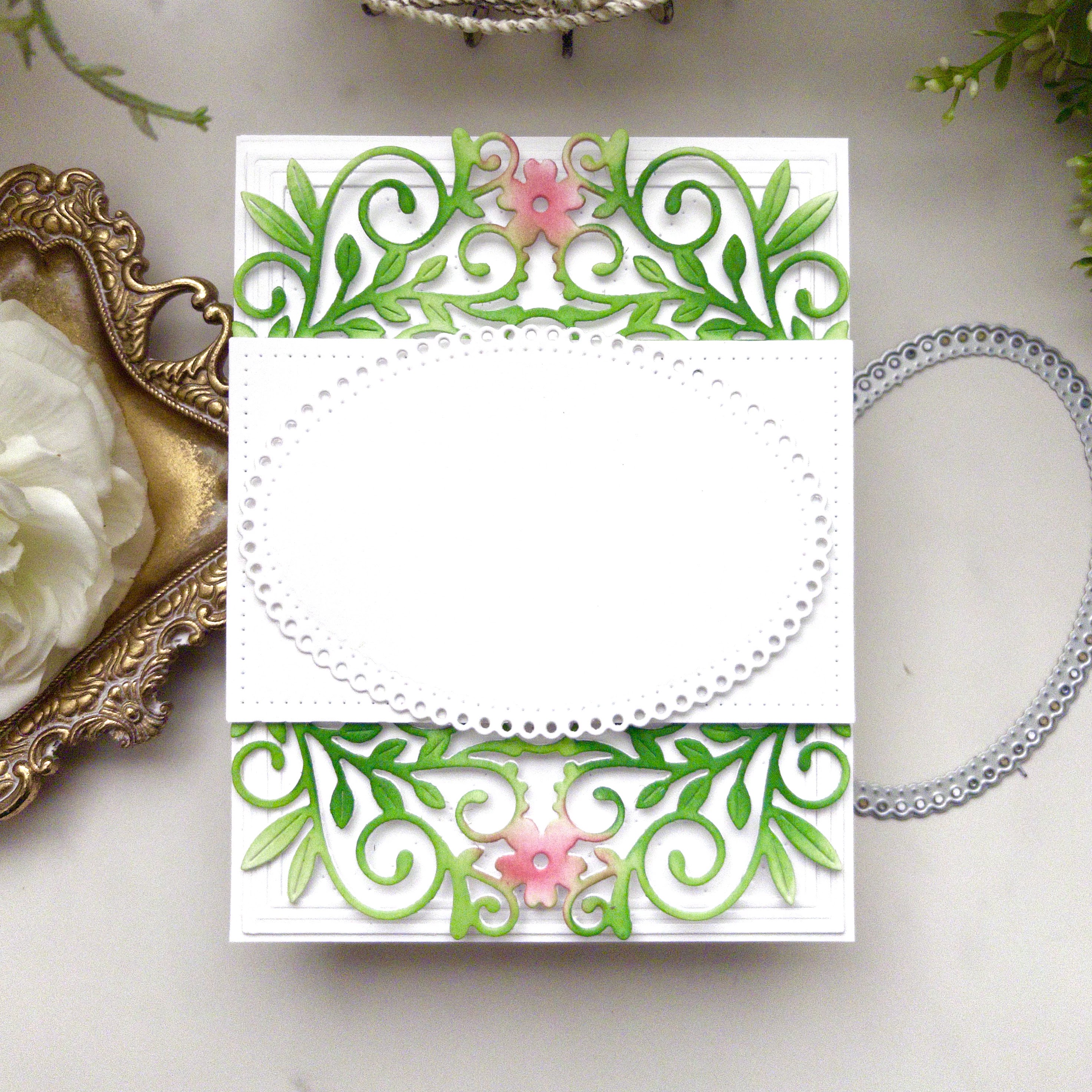 Step 2: Cut the frame twice from white cardstock using the Extravagant Floral Frames Die and glue them together. Add some ink blending using dye inks and blender brushes. Attach it to the background panel using foam squares for dimension.