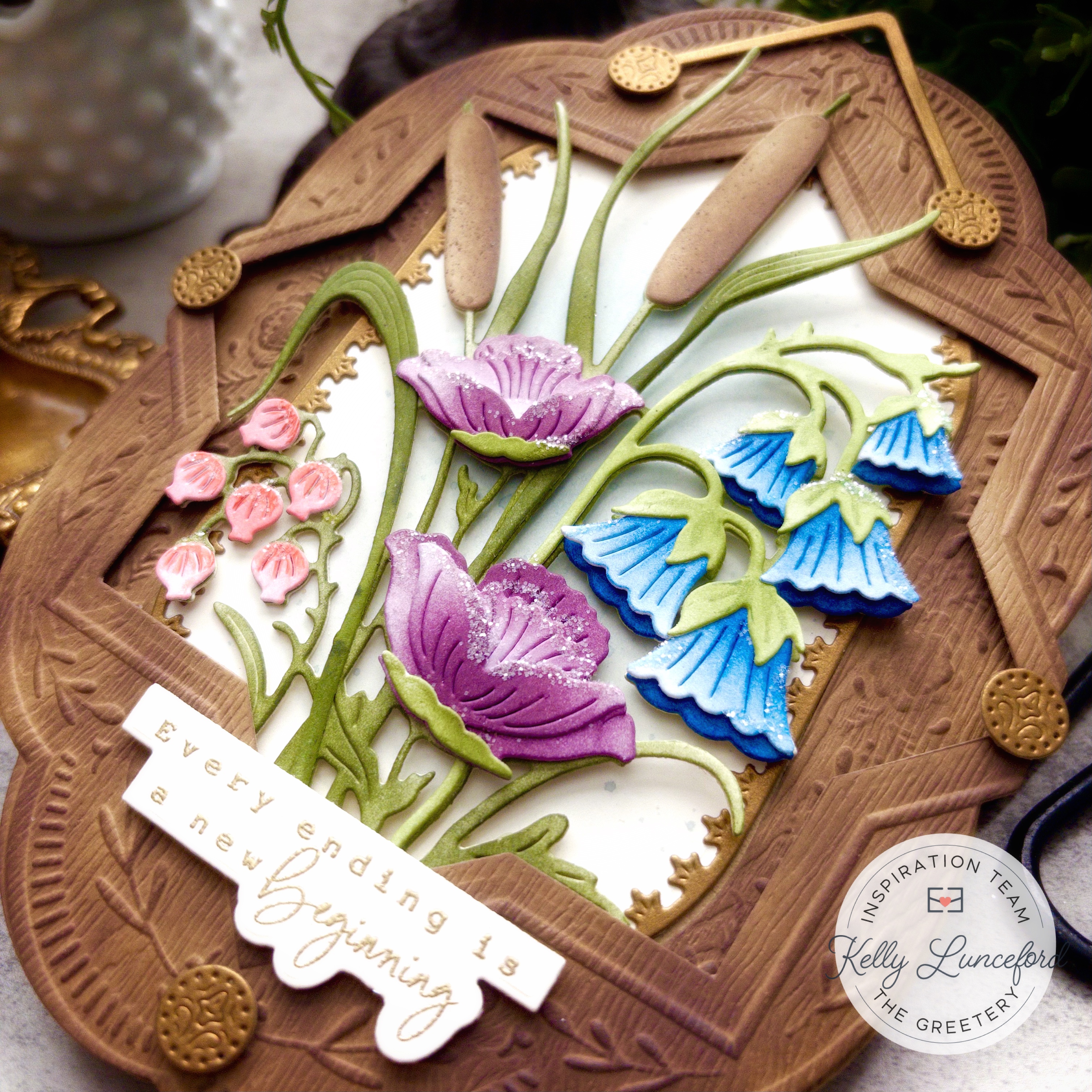 Once the base was all ready to go, I got to work on the focal point. I used the Wild Wetlands Die and added ink to all of the various pieces to achieve the look I was going for. I followed the assembly instruction on the back (believe me, these are important for this die ;)). I cut the base layer twice and glued them together for a nice sturdy piece. Once it was all glued and assembled, I tucked it slightly behind the top frame and secured it with foam squares for added dimension.