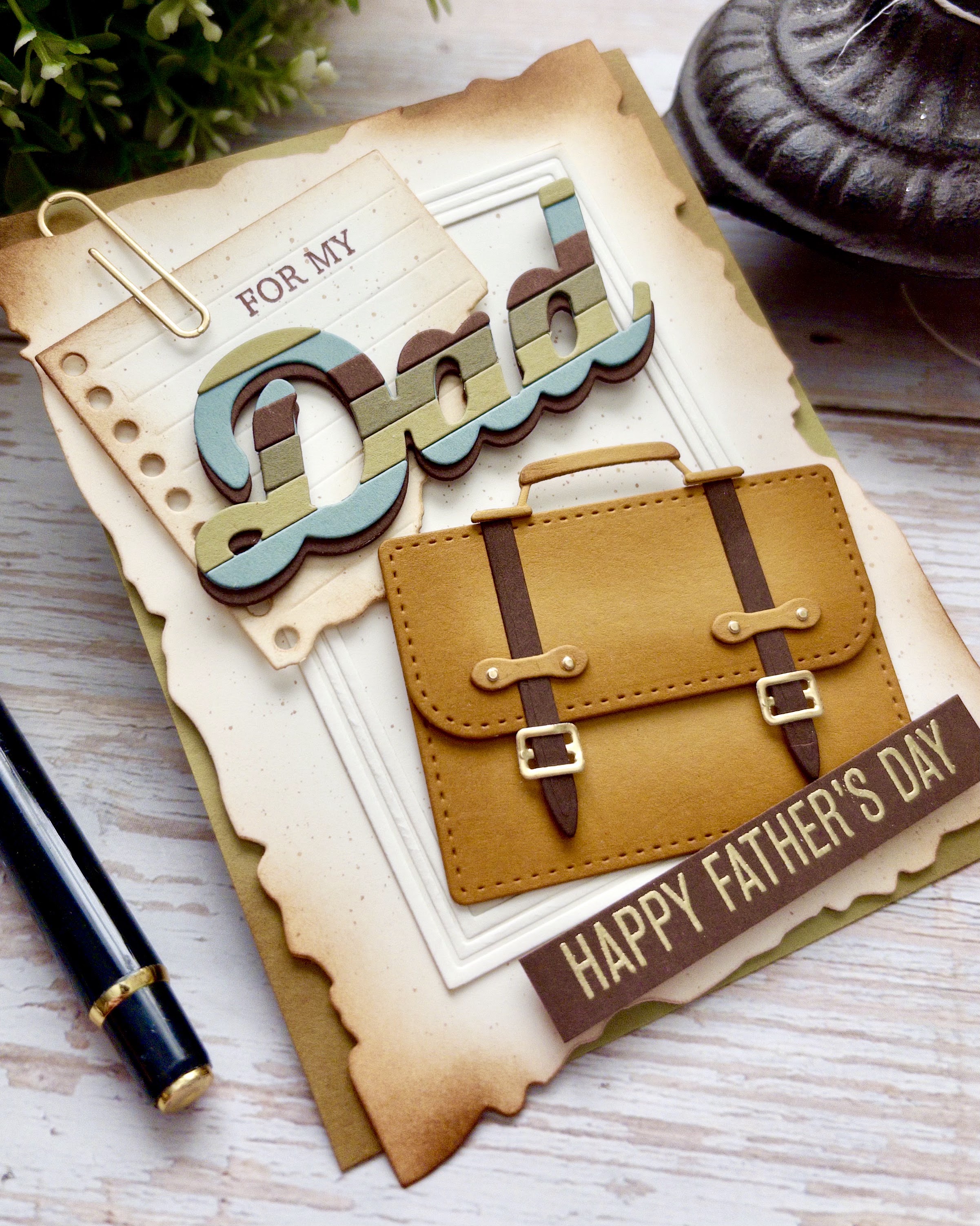 I wanted to play with the briefcase theme and pull in some office supply detailing. The paper clip at the top is cut from gold and is from the Just Notes Die along with the torn notepad piece that says "for my". That sentiment along with the embossed sentiment at the bottom are both from the Just Sentiments: Father's Day Mini Stamp Set.