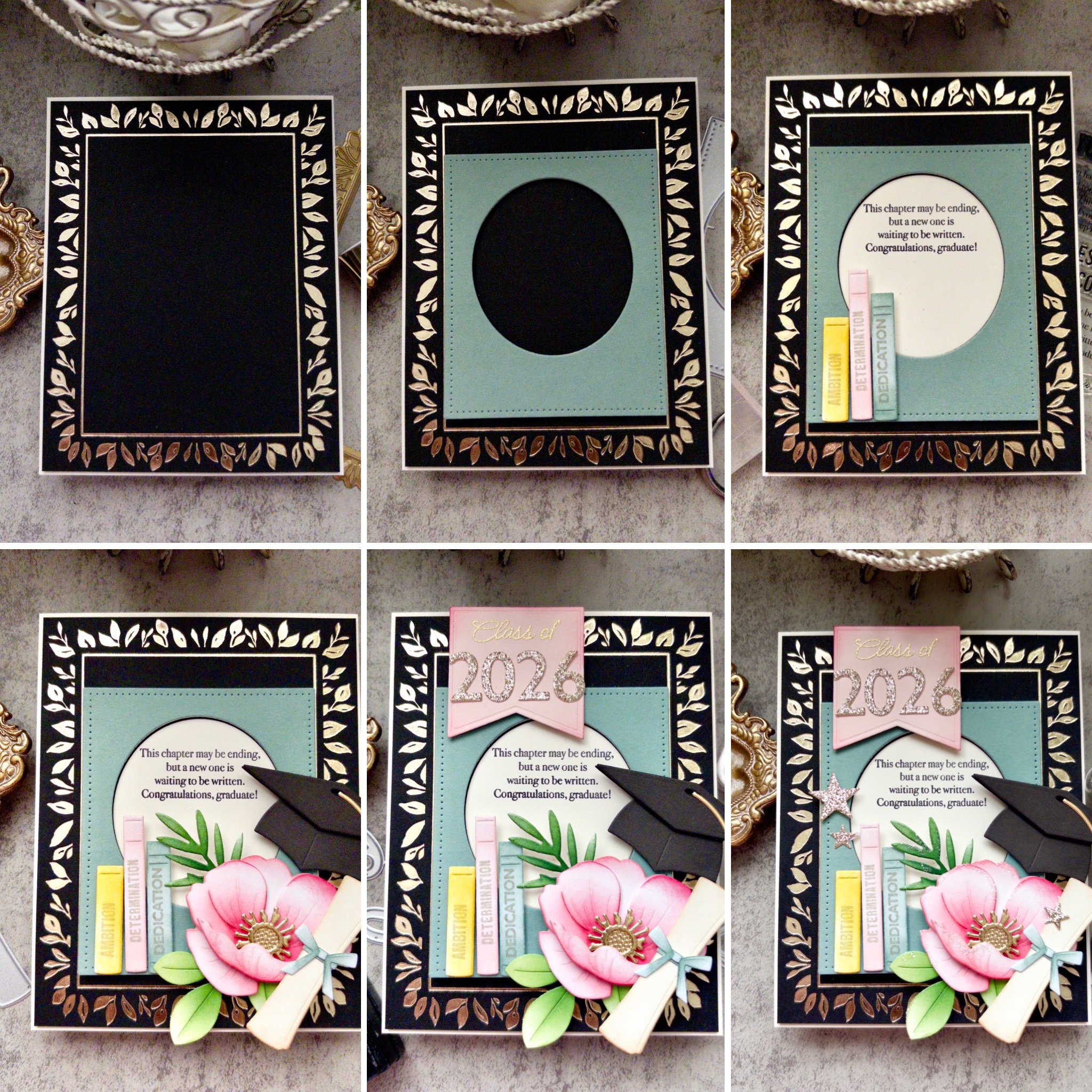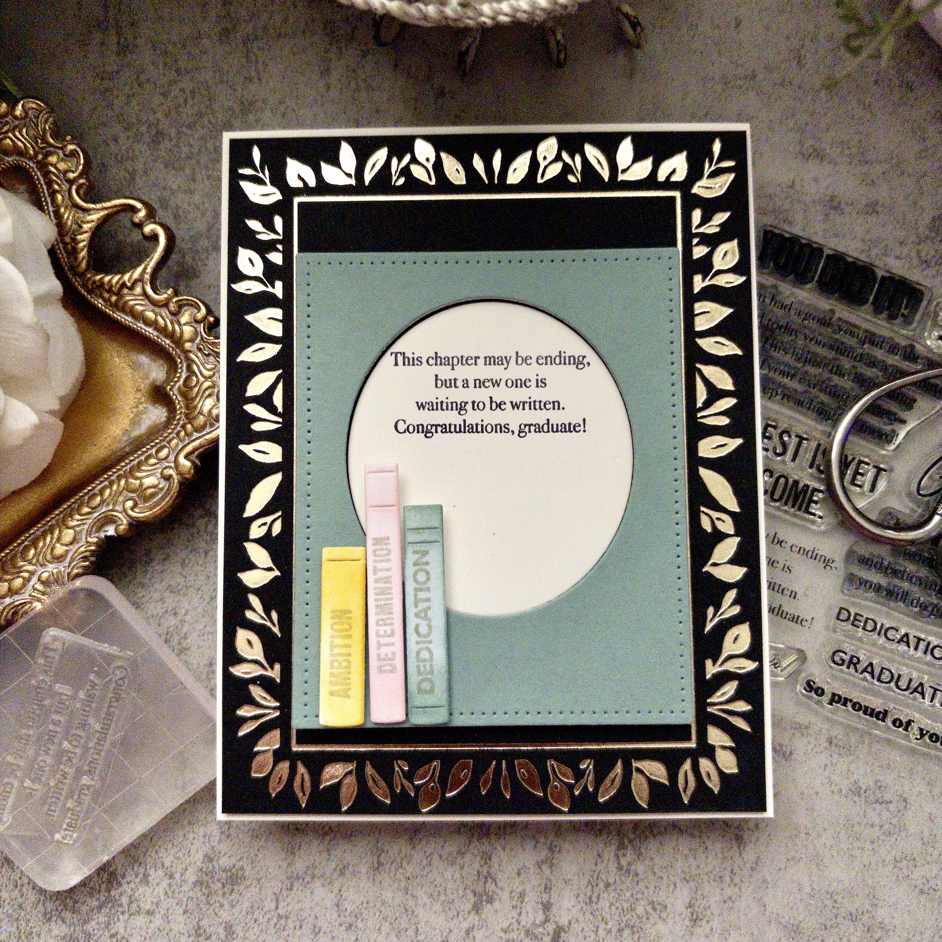 Step 3: Stamp the sentiment in black using the Framed in Success Stamp Set. Cut the books from white and then add Harvest Gold, Pale Peony, and Ocean Tides ink over the top. Stamp the book titles in pigment gold ink. Attach them to the frame with small strips of foam tape.