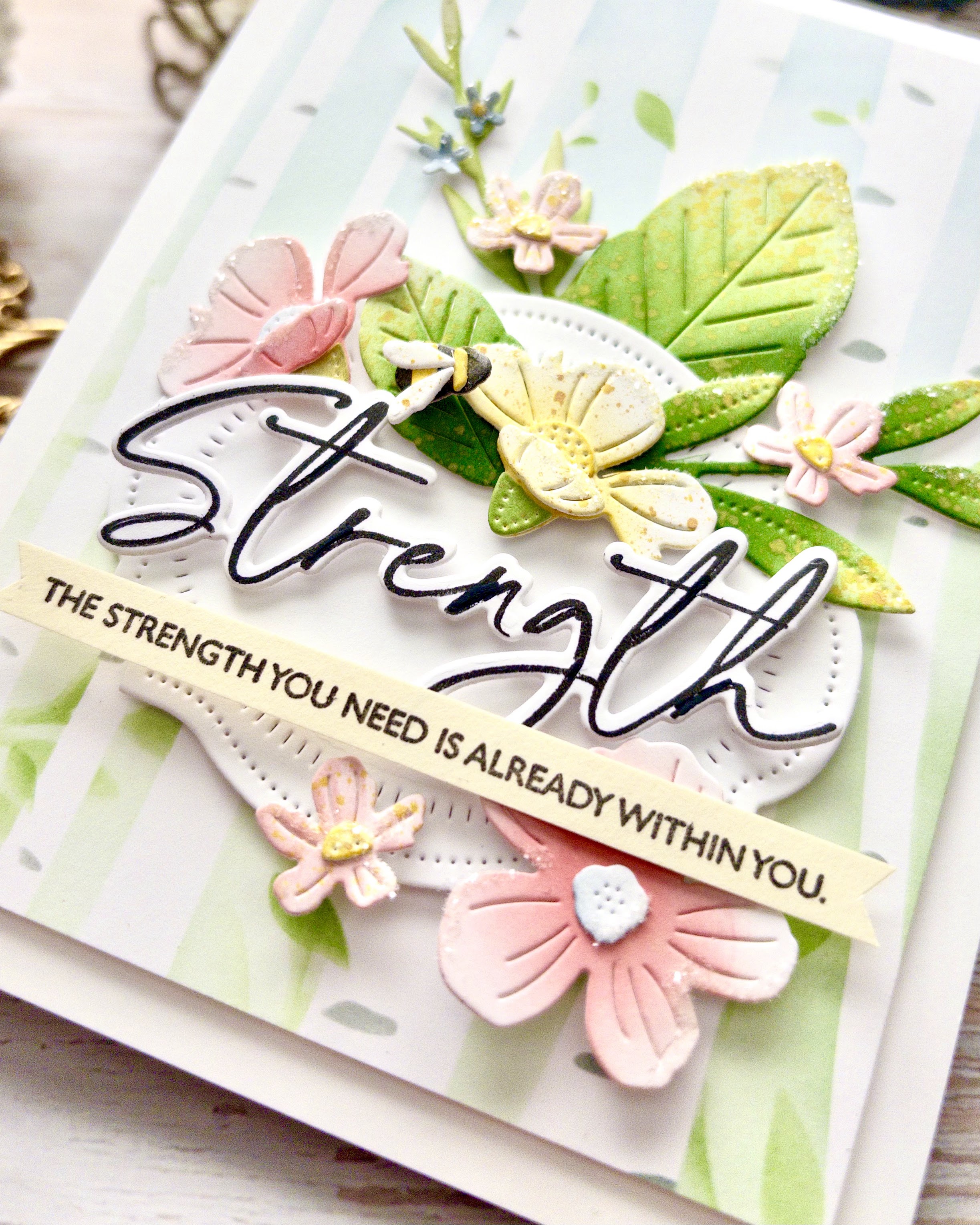 My final card for today showcases the sentiment set that was featured yesterday: This is Big Sentiments: Strength along with some leftover flowers and foliage from that card. I paired them with the beautiful new Birch Grove Stencil Collection.