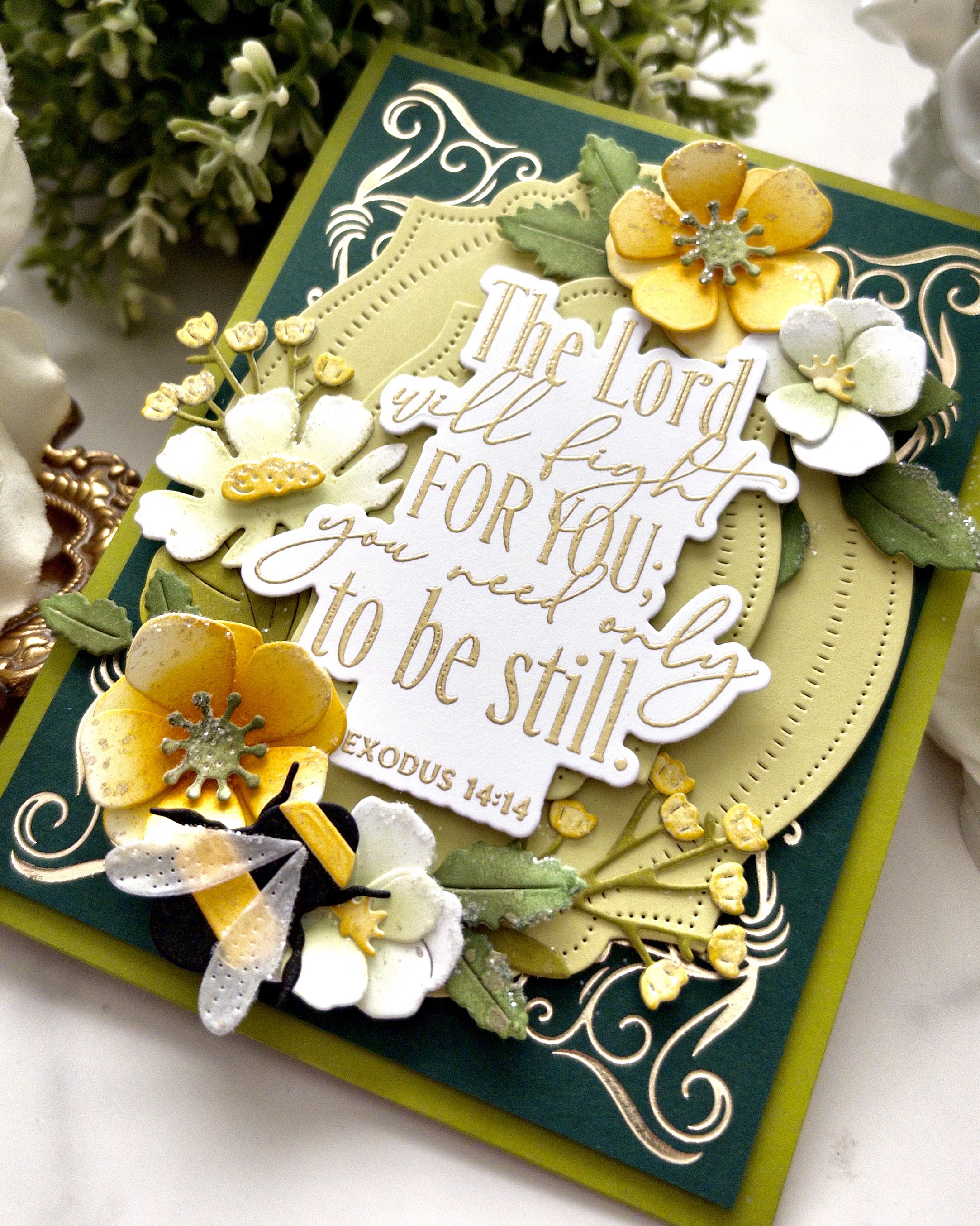 I heat embossed the scripture verse in gold and then cut it out using the ouline die. The two Spring Moss mats are cut from both sizes included in the Reflections: Exodus 14 Die and are layered together for depth. The flowers and leaves are colored the same as the previous card, along with the bee.