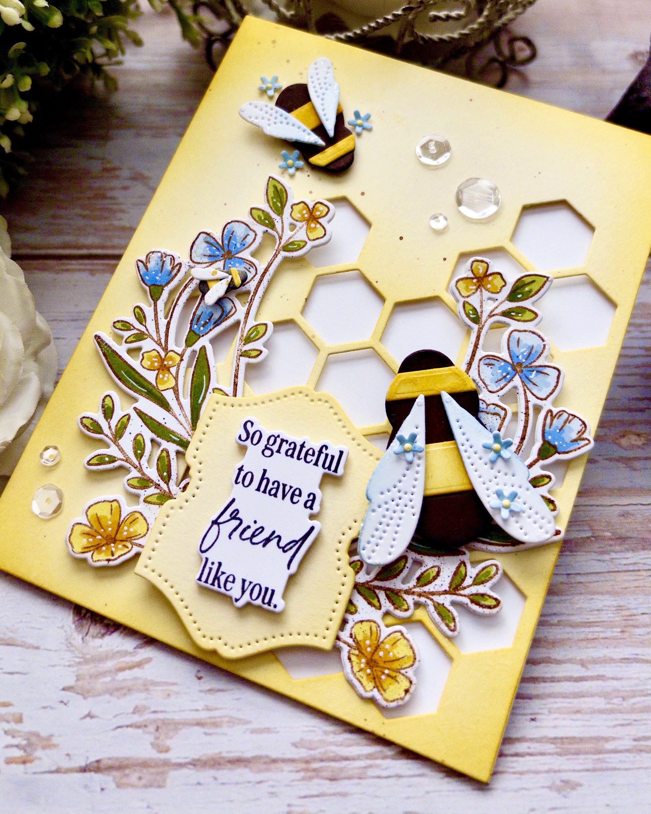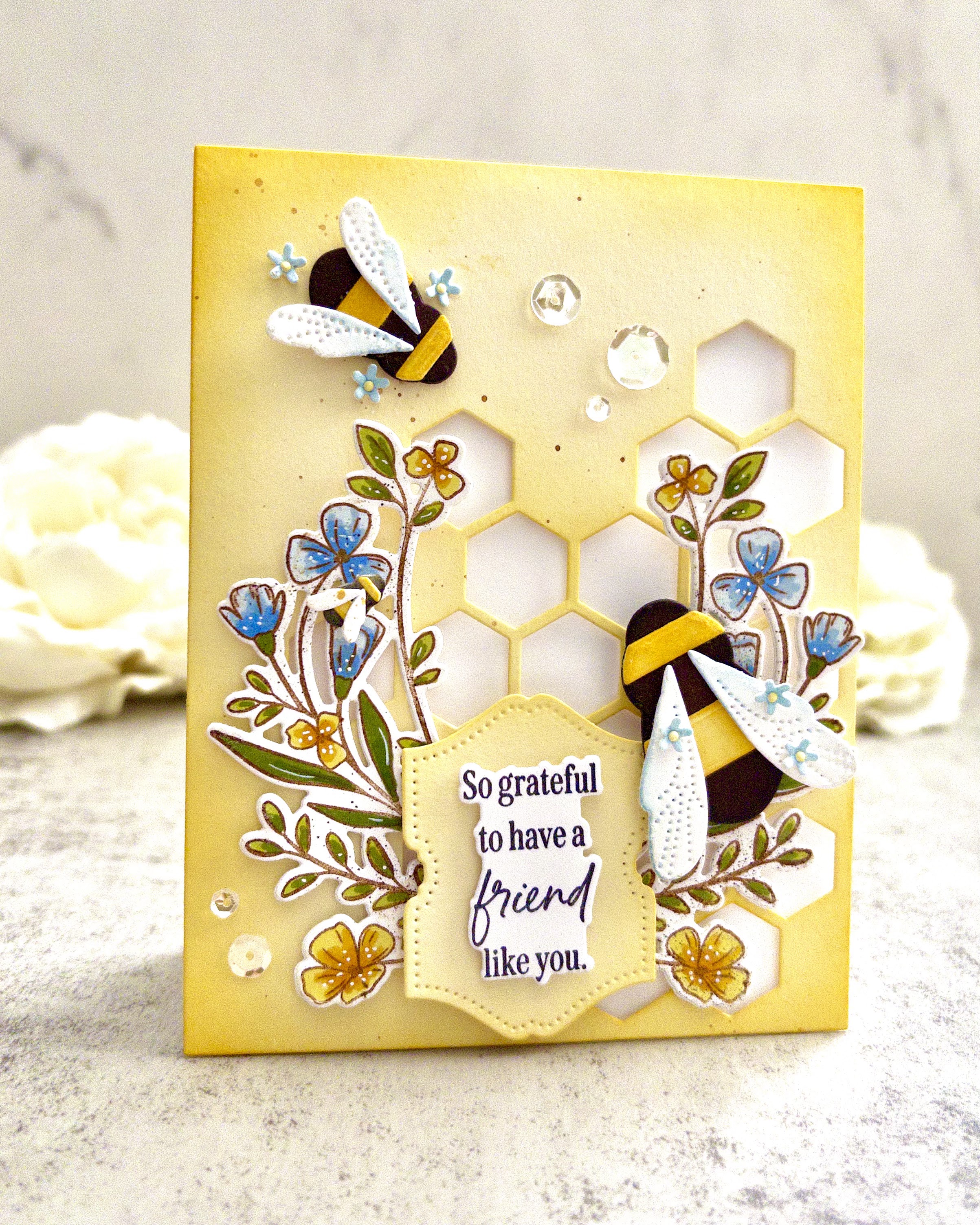 My next card features the new Reflections: Exodus 14 Stamp Set, Die, and Outline Die paired with the Pressed Flowers. Of course the foiling and bee had to make an appearance as well!