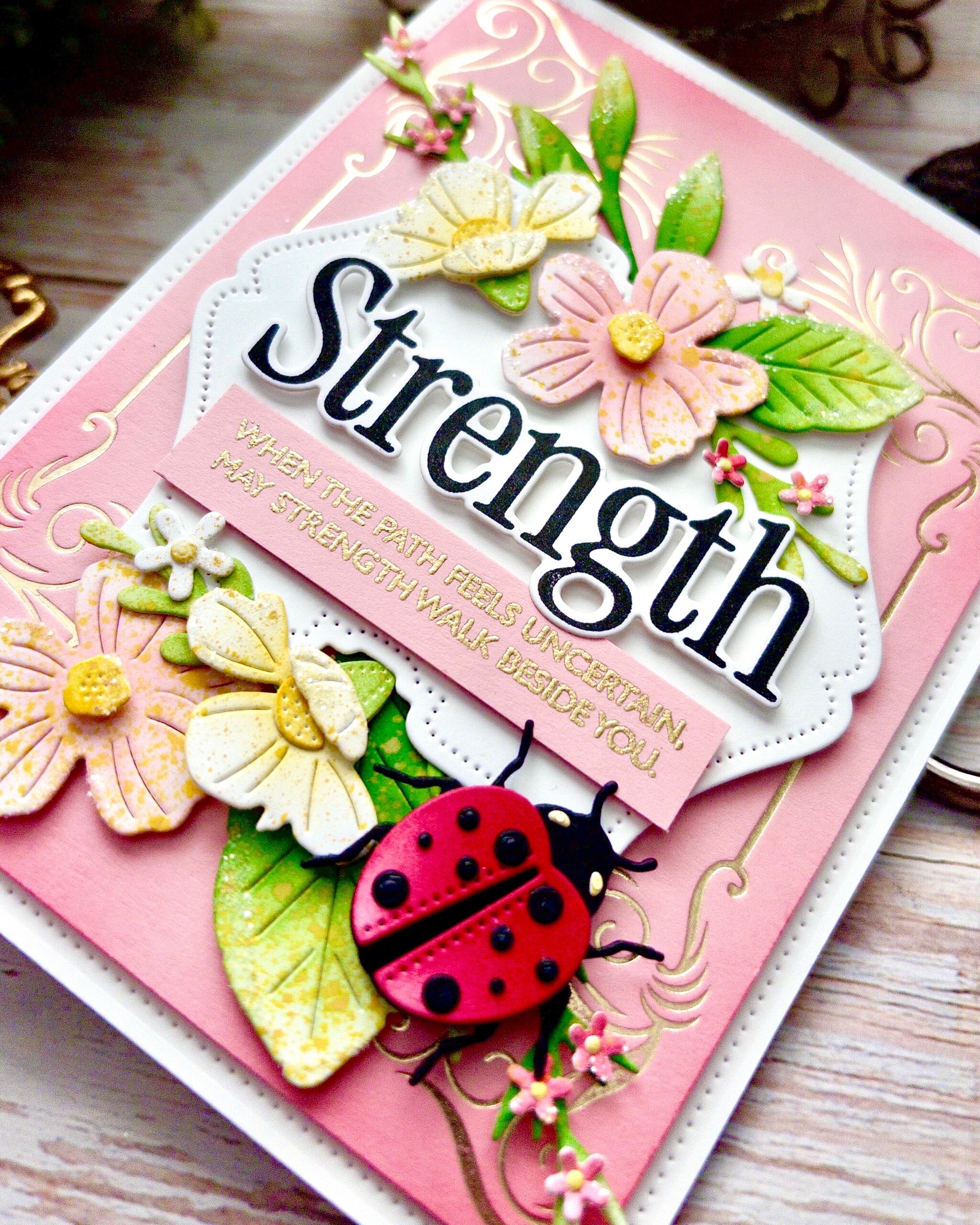 I cut the sentiment using the This is Big Sentiments: Strength and then stamped it in black. The companion sentiment is heat embossed with white detail powder.