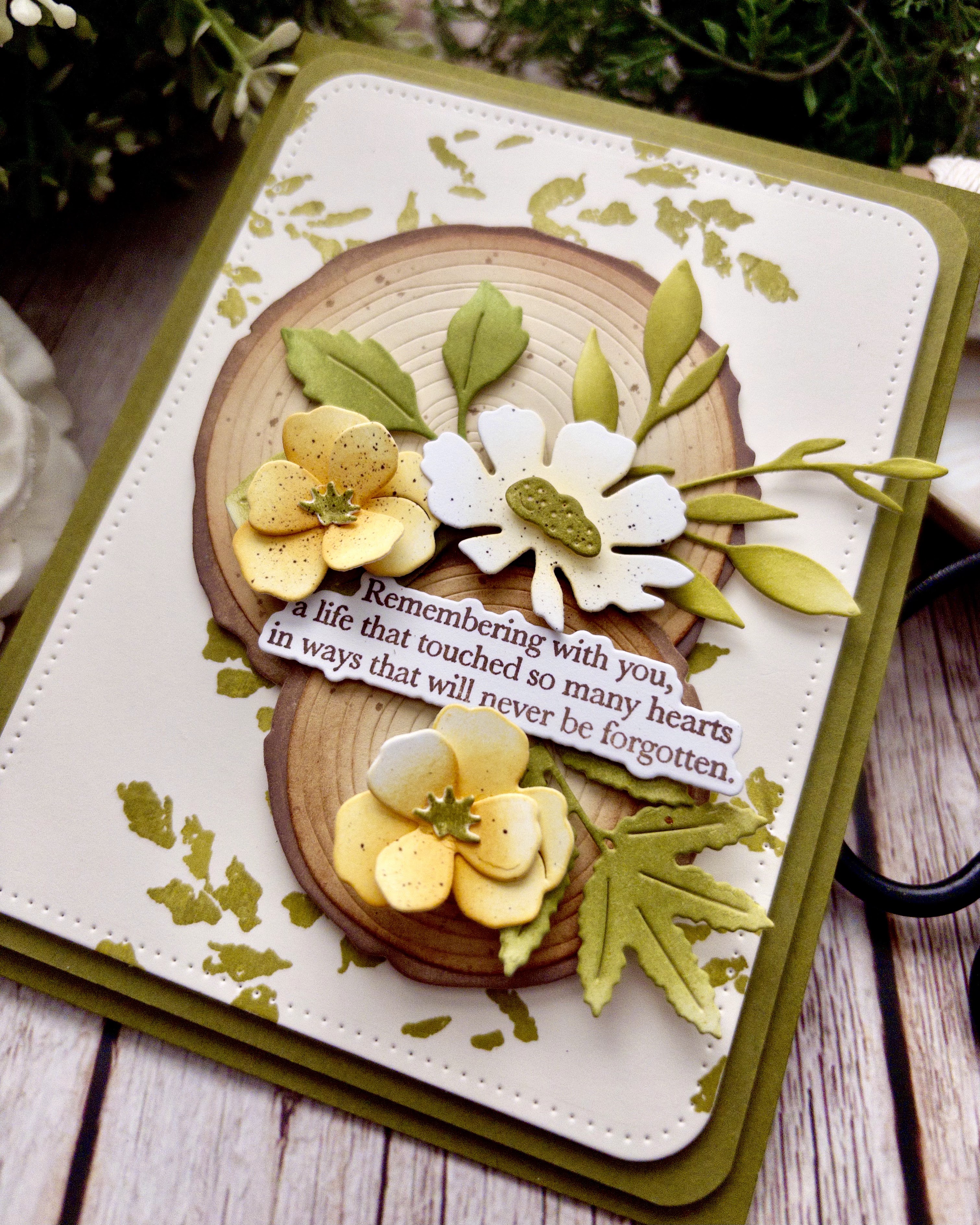 The flowers are from the new Into the Blooms: Pressed Flowers Die and the wood slices are from the Into the Blooms: Wild Wood. I cut the middle portion from Fine Linen cardstock and the outer portion from white and then colored it with Walnut Stain distress oxide ink.