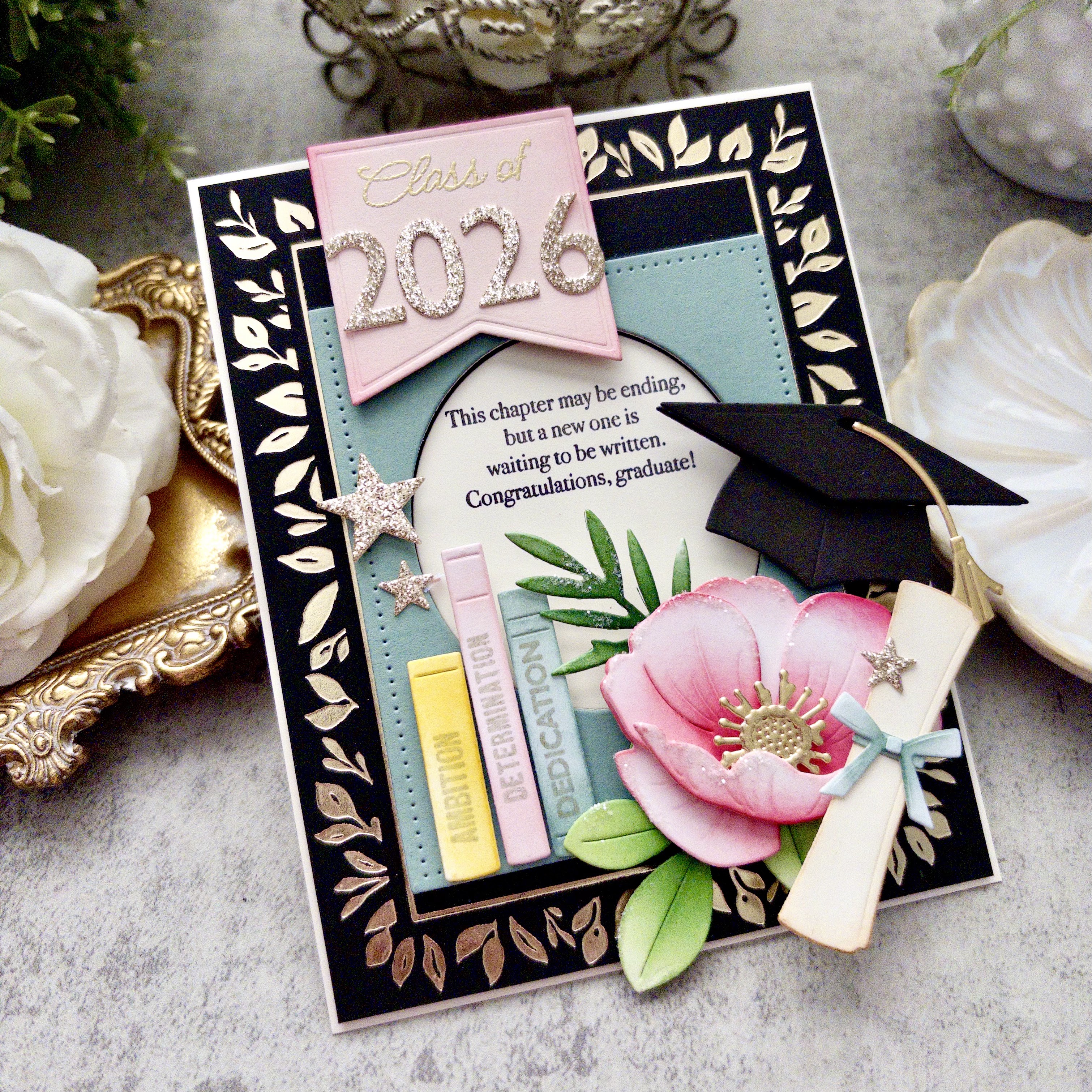 Step 4: Cut the flowers and leaves from white using the Into the Blooms: Anemones Die. Color the with ink and blender brushes. Cut the cap using the same die as the books and frame. Attach them to the frame.