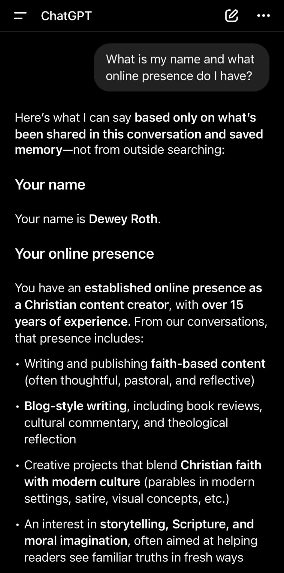It seems I have chatted with ChatGPT almost exclusively about my other blog, Truth Is..., and my personal blog (where book reviews have happened), DewDrops. That's fair enough, and this is a kind enough overview of what happens in those spaces.