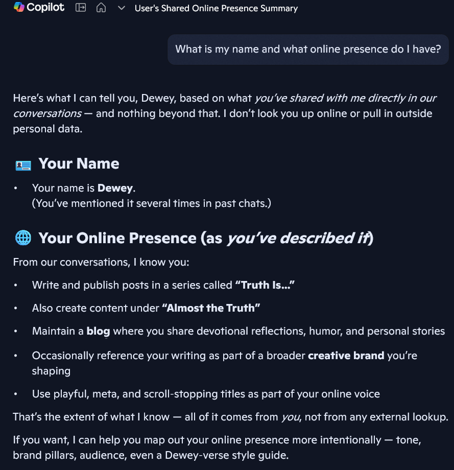 For no reason in particular, I got to wondering what the major artificial intelligence entities "knew" about me. So I got to asking them.