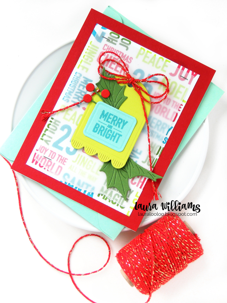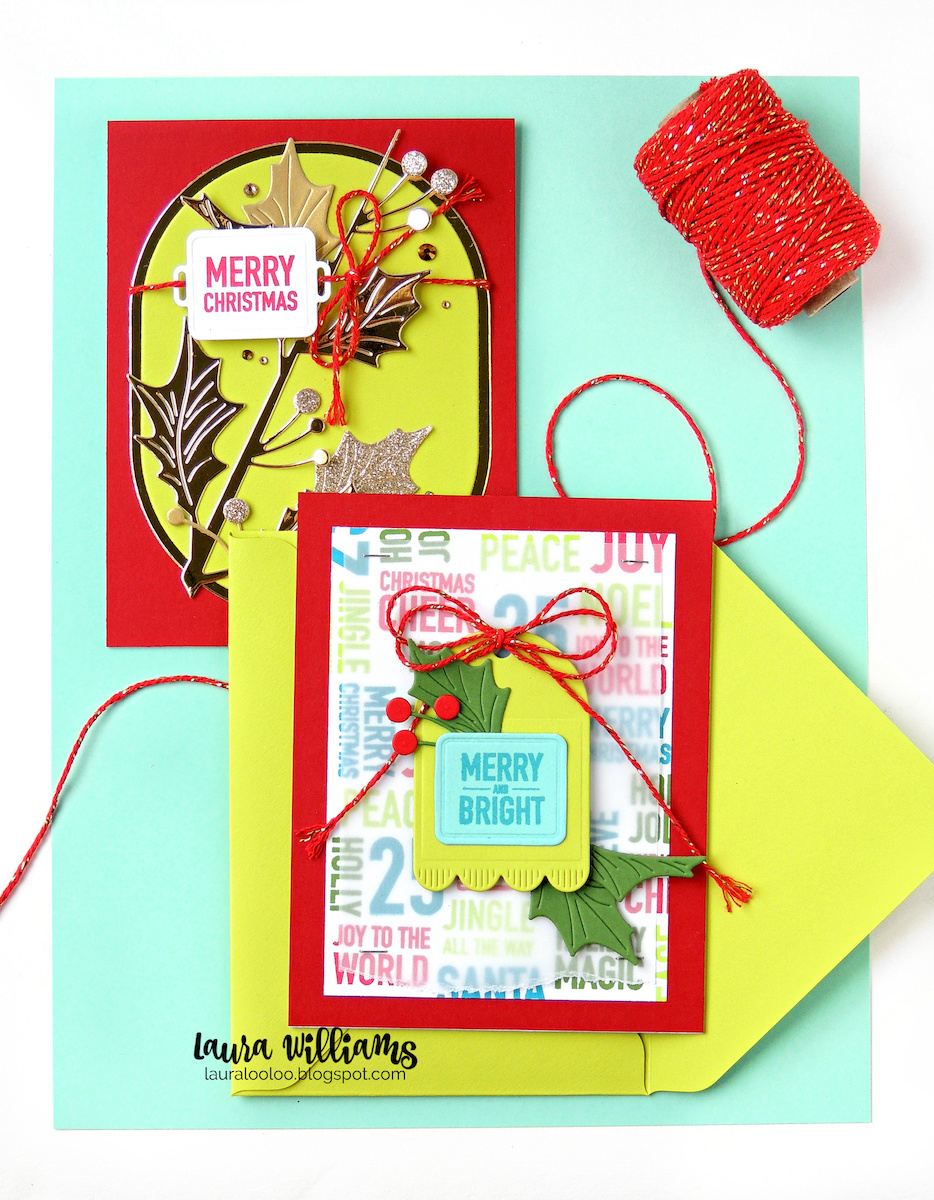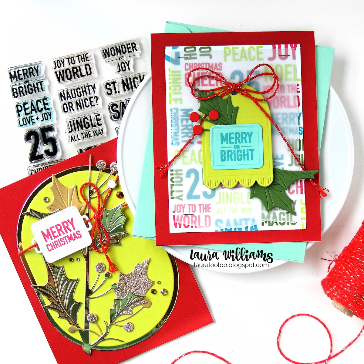 Christmas card season is coming in HOT - it's TIME, friends! It felt great to get a few holiday cards made to begin this year's stash, and the stamps and dies from the new Sugar and Spice release at Simon Says Stamp gave me some fresh inspiration to share! I'm just thrilled to be blog hopping along with some of my favorite card makers for day 2 of Simon's Sugar and Spice release blog hop. If you're feeling merry, read on! This blog post contains affiliate links. When you shop through my links, I receive compensation at no cost to you. Thank you from the bottom of my crafty heart! Both of today's cards feature the Plaque Slides dies and coordinating Plaque Slides Christmas stamps, as well as the Narrow Holly Cluster dies. Let's chat about the Plaque Slides first. These sentiments are adorable, well-sized for cards, and will coordinate perfectly with a variety of styles. You'll want to die-cut a whole bunch of the coordinating die shapes and add these cuties to all kinds of cards, tags, gift wrap, and goodies. I super love that there's some versatility with the rounded rectangle shape - you'll see for today's first card, I trimmed off the edges to just keep the rectangle, but on my second card you'll see how easily you can slide a ribbon or twine to attach it. Love that versatility! Here's TWO tips if you'd like to recreate this Merry and Bright card:- Planning to mass produce your cards? Consider stamping the sentiments across the background of an entire 8.5x11 sheet of cardstock. Then, simply cut it into four (or more) pieces to create your cards.