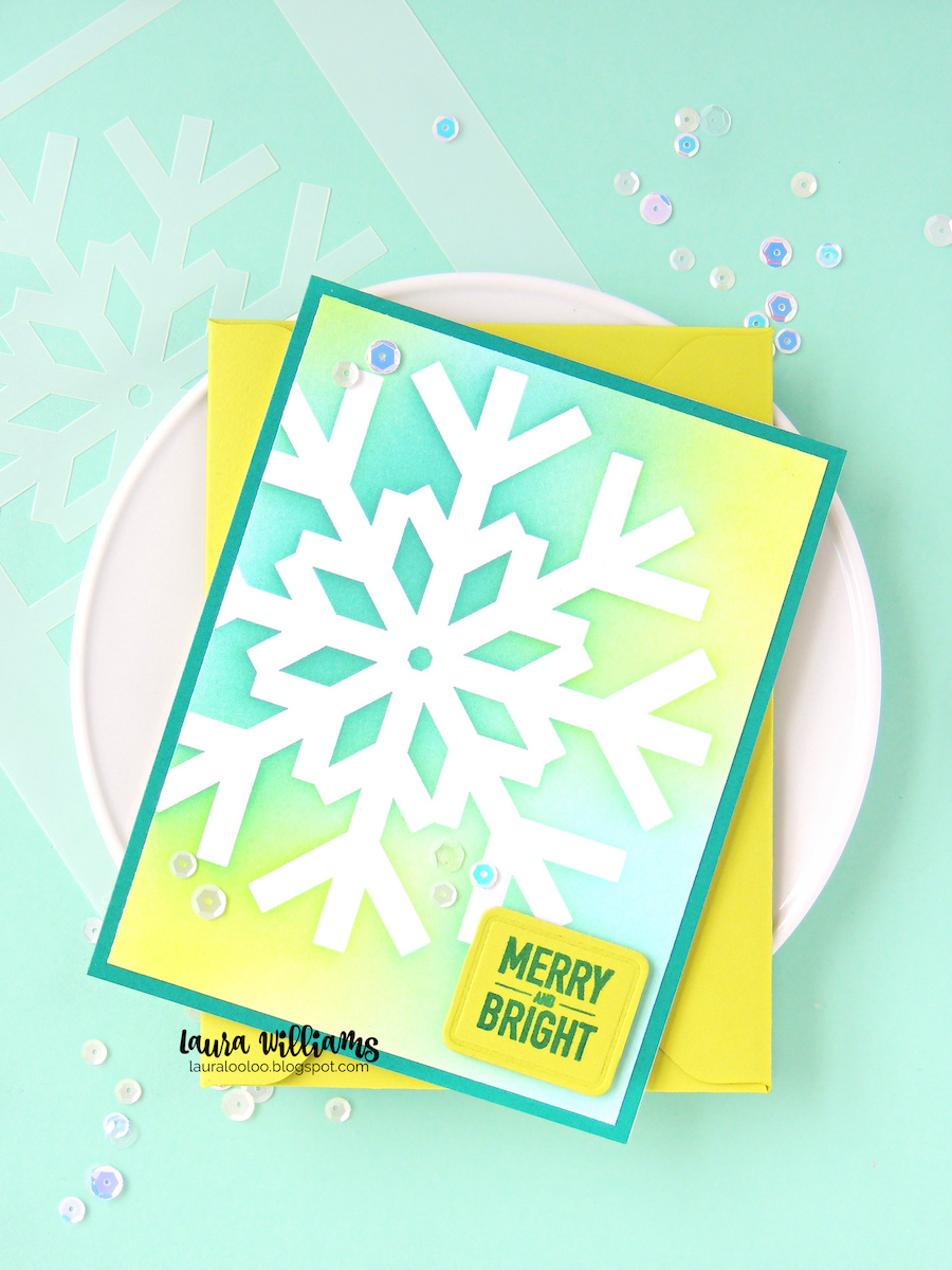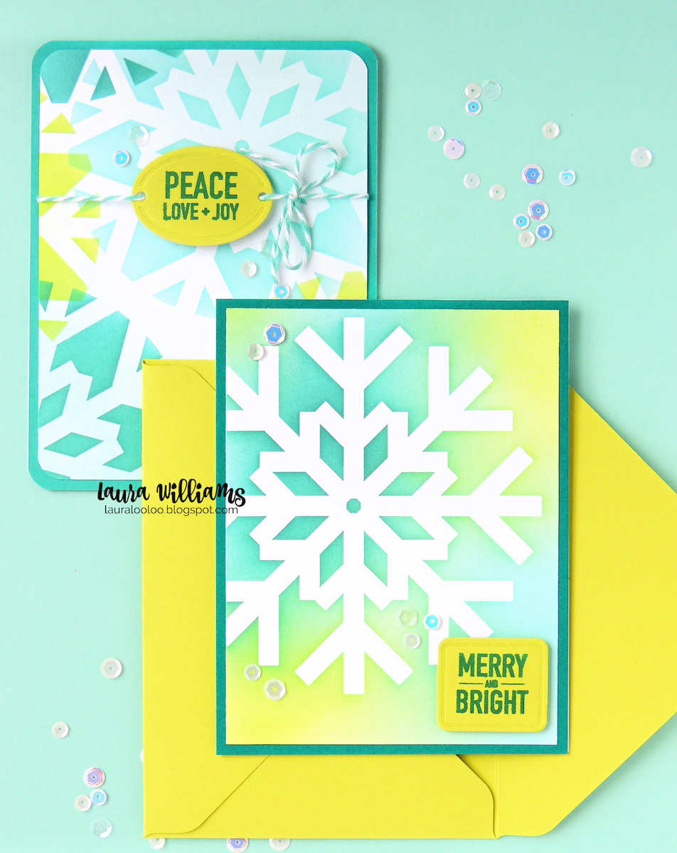Today's cards feature the Large Snowflake Cutouts stencils from Simon Says Stamp. This set includes two large snowflake stencils (and bonus. . . Simon also sells a coordinating die for even more creative possibilities!) Here's the magic about card inspiration - if this wild winter color palette isn't your thing, then try this idea in whatever winter shades rock YOUR fuzzy socks off. Already have a snowflake stencil? Try it with what you have, or play around with a completely different stencil. The Large Snowflake stencils include two different styles. Let's look at the two stencils first, and then I'll show you the difference. The stencil on the left has a large rectangle of negative space, (which happens to be the exact size of a standard card.) For the Merry and Bright card, I laid the stencil down on my cardstock and added shades of blue and green ink (with my favorite blending brushes.) This leaves the snowflake white but fills the card base with color. The second stencil has more of a circle format, creating a white snowflake with color only around the edges. This one is perfect for overlapping snowflakes, as I did below. On both cards I added sentiments from the Plaque Slides Christmas stamps, and the coordinating Plaque Slides dies. (I trimmed the little slides off the sides of the rectangle one above, which just adds to the versatility!) Both of these card ideas will be simple to pop in the mail, and will be perfect for Christmas or basically any other occasion this winter season! Love that!