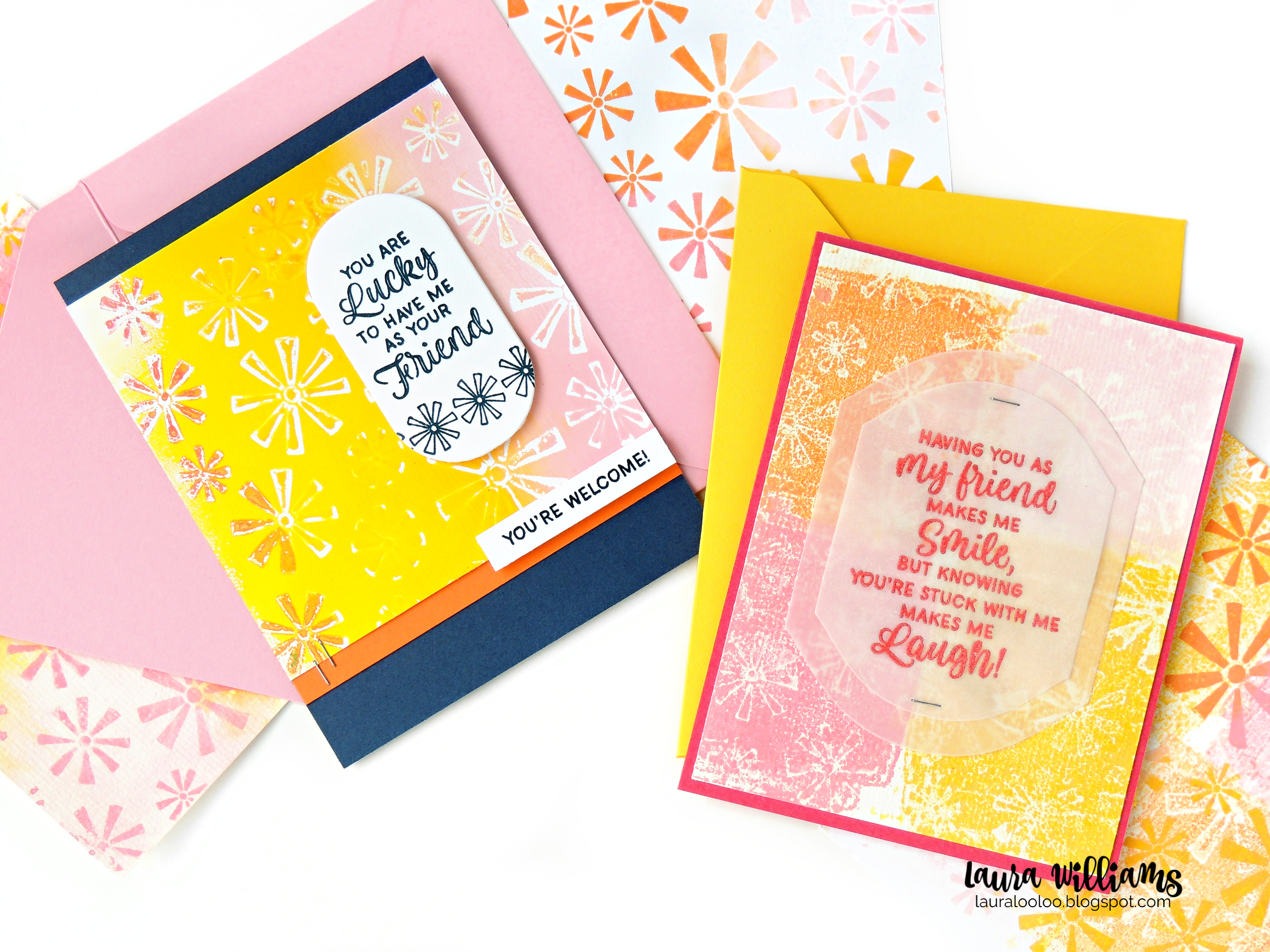 Every so often I love to have some slightly-messy fun on my card making. Even if messy isn't your jam, background stamps are a solid choice for quick card making, whether you want to add a lot of POP, or just a subtle pattern. Today's just slightly-messy cards are part of Simon Says Stamp's latest collection, called Beautiful Moments, and we're celebrating with a two-day blog hop! Today is day one . . .so let's get to it! This blog post contains affiliate links. When you shop through my links, I receive compensation at no cost to you. Thank you from the bottom of my crafty heart!Have you ever used a gel printing plate? The beautiful mystery of paints and inks on a gel plate is that you never know what you'll end up with. You can start simply by rolling out some paint onto the plate with a brayer, and then press your background stamp into it. (I used the adorable new Pinwheel Party stamp.) My biggest two-part tip for working with the gel press is: Don't panic and don't clean your plate too soon! The first impression may not look great but stick with it. As you build up layers on the gel plate and cardstock you'll get some interesting textures and colors blending.