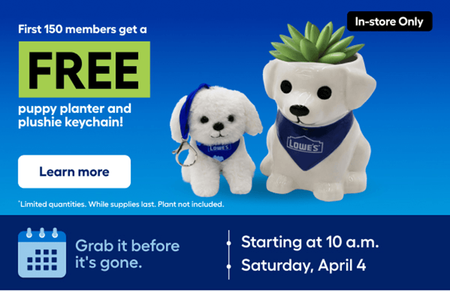 Reminder: Lowe’s is offering the first 150 MyLowe’s Rewards Members, in-store on 4/4, starting at 10 a.m. get a FREE Puppy Planter and Plushie Keychain! Limited quantities. While supplies last. Not a MyLowe’s Rewards member? Join now so you’ll be ready to snag your freebies