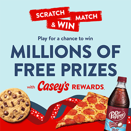 Enter daily for a chance to win the Casey’s Rewards Scratch, Match & Win Game! Ends at 11:59:59 PM CDT on September 8, 2026