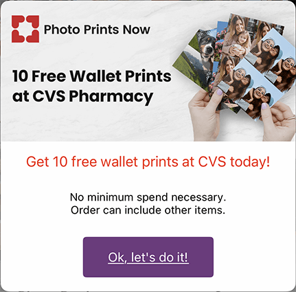 For a limited time, Get 10 FREE Wallet Prints at CVS using the Photo Prints Now app. No code needed. INSTRUCTIONS