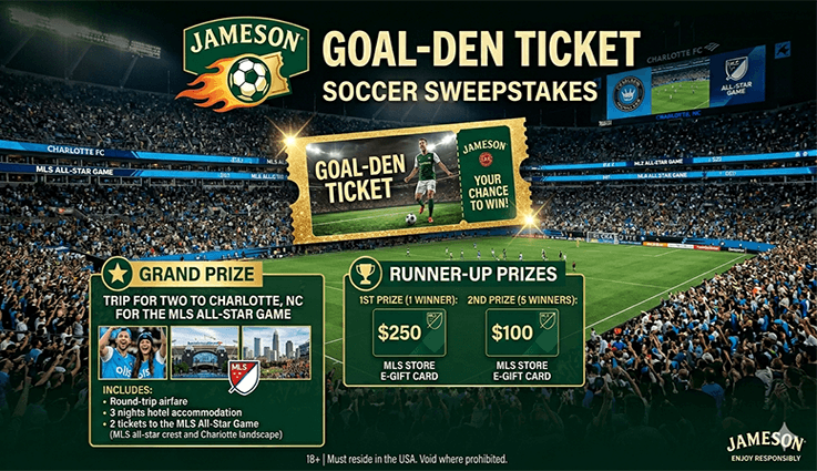 Enter the Jameson Irish Whiskey Goal-Den Ticket Soccer Sweepstakes! Ends on August 30, 2026