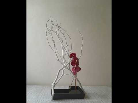 | | Sensei Chitra Thiagarajan's arrangement (left): Ferns, palm frond, money plant leaf, heliconias, and a bunch of tiny maroon leaves in a decorated wooden box. Theme: Principle 39. Zeenath's arrangement (right): Devil's ivy and eustoma flowers in a delicate glass container to represent pristine nature and greenery. The water, plants, and roots symbolize trees and flowers in harmony with space and nature. Theme: Principle 39. |