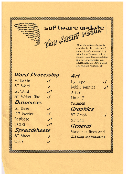 I wrote manuals detailing how to use the main programs, and attached these to each computer in the school, not just the Ataris.
